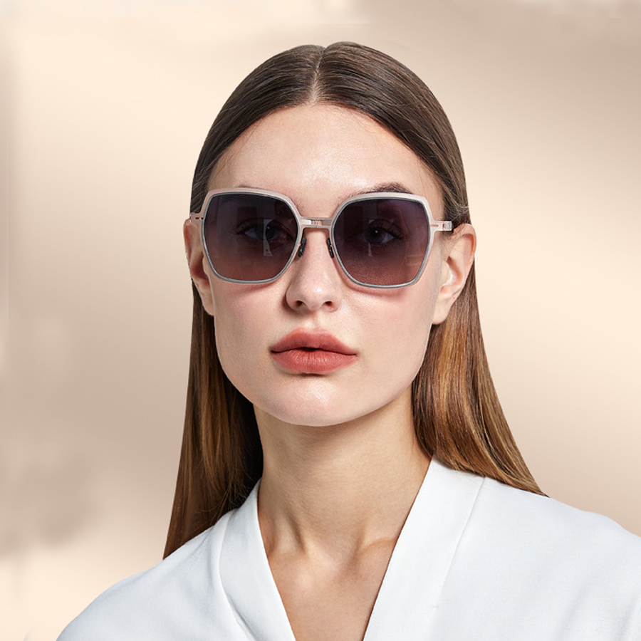 The frame of these sunglasses is crafted from a metallic alloy, most likely stainless steel or a gold/silver – plated alloy. This material not only gives the sunglasses a sleek and reflective finish but also ensures a lightweight structure. The polished metal edges and smooth, clean lines are a testament to the high – quality craftsmanship. The temples are thin metal frames, with optional plastic or rubber accents at the ends for enhanced comfort and grip during wear.