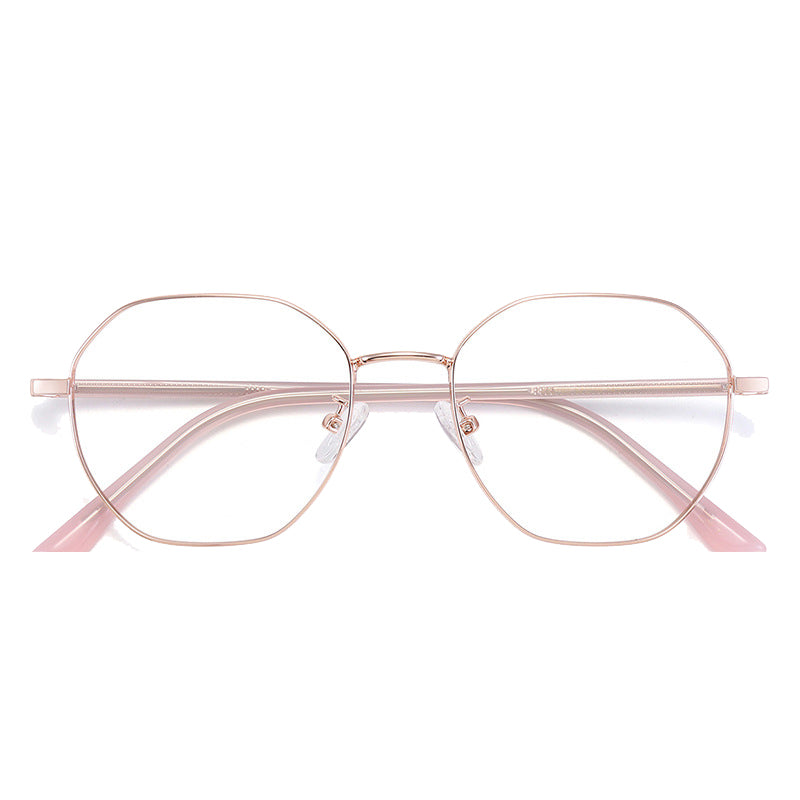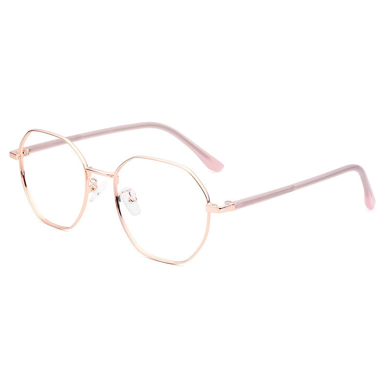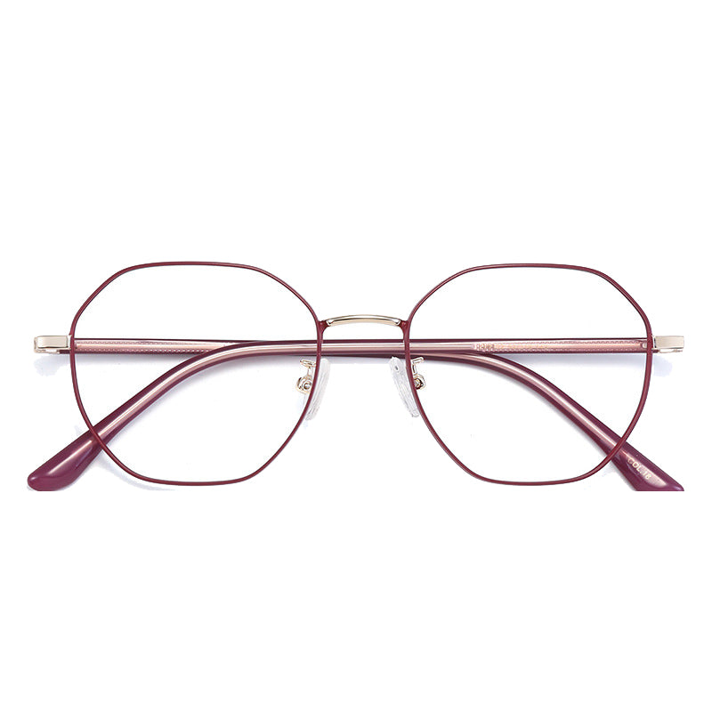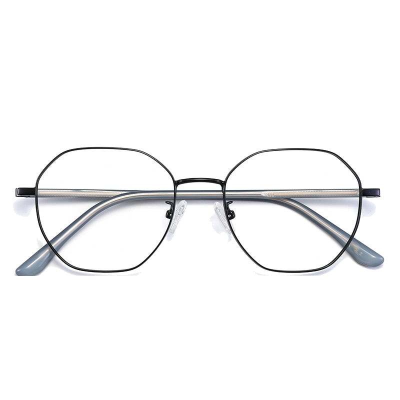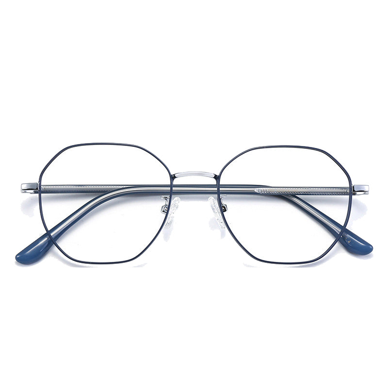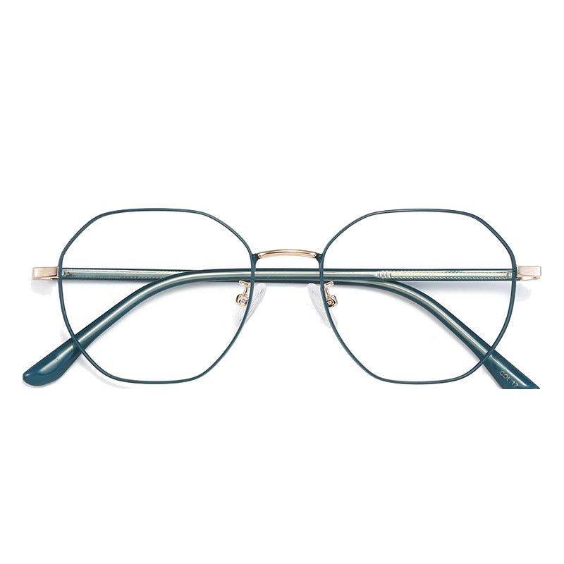 Available in a variety of eye – catching colorways including black, blue with silver accents, teal (green) with gold accents, purple with gold, rose gold, and silver, these glasses can be tailored to diverse style preferences. The lenses feature a modern, geometric hexagonal/octagonal wireframe shape, adding a trendy and unique aesthetic. The thin, straight metal bridge connecting the lenses has a subtle curve for a perfect nose fit, and the arms have metallic cores with smooth, colored plastic/acetate tips that are rounded for comfort behind the ear.