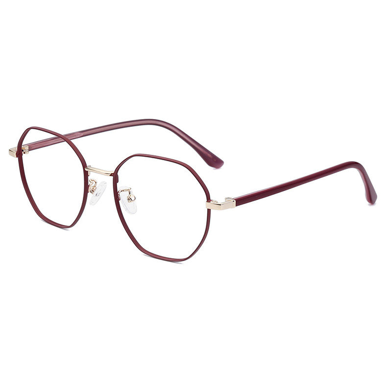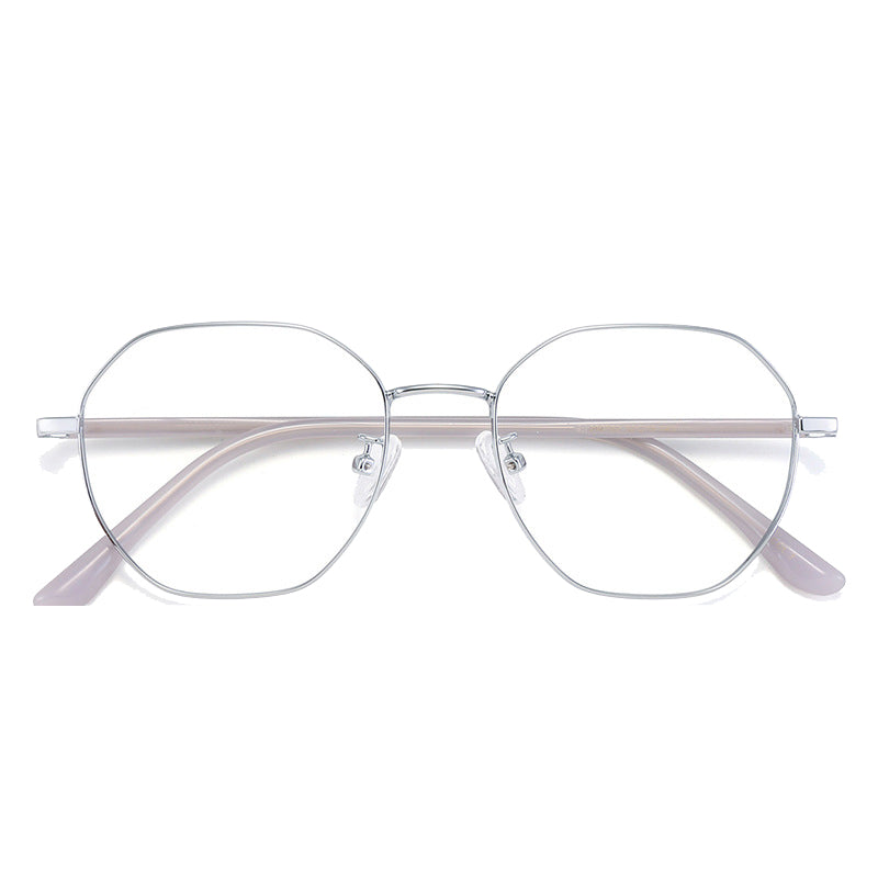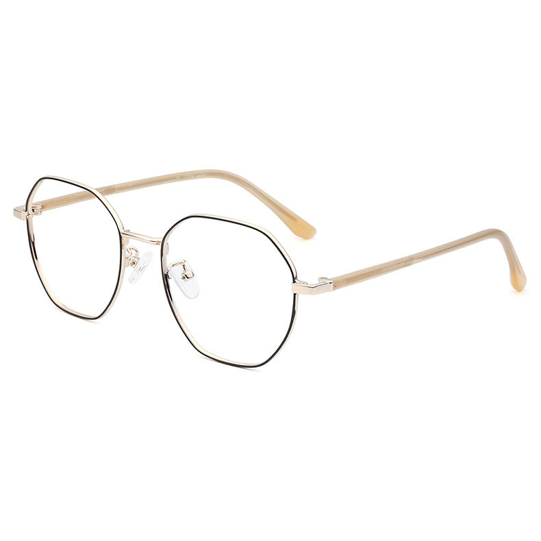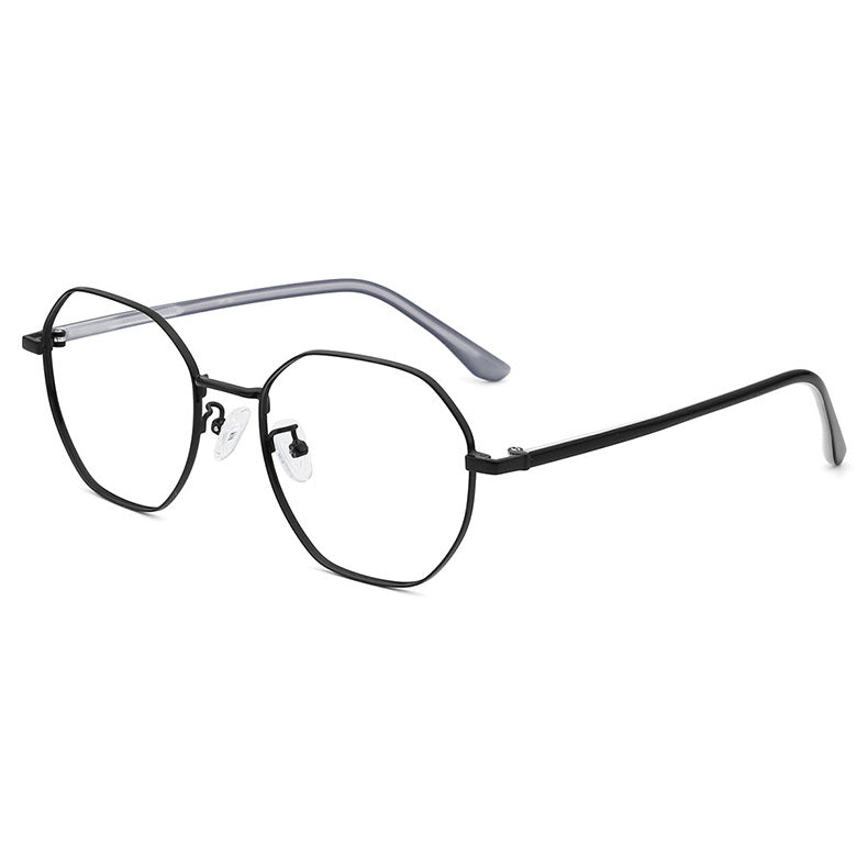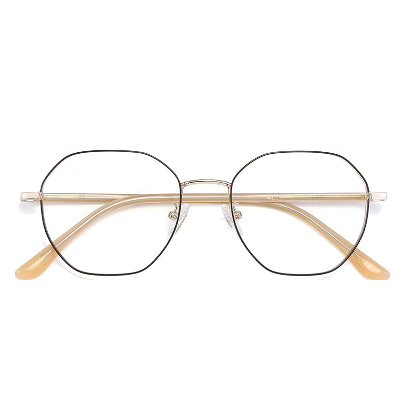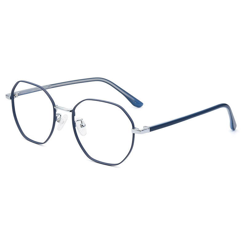 Available in a variety of eye – catching colorways including black, blue with silver accents, teal (green) with gold accents, purple with gold, rose gold, and silver, these glasses can be tailored to diverse style preferences. The lenses feature a modern, geometric hexagonal/octagonal wireframe shape, adding a trendy and unique aesthetic. The thin, straight metal bridge connecting the lenses has a subtle curve for a perfect nose fit, and the arms have metallic cores with smooth, colored plastic/acetate tips that are rounded for comfort behind the ear.