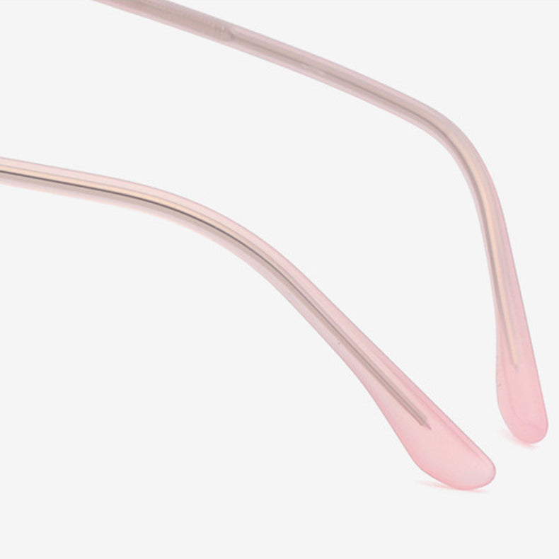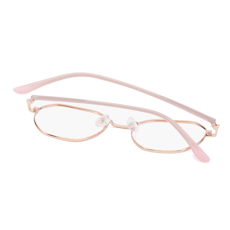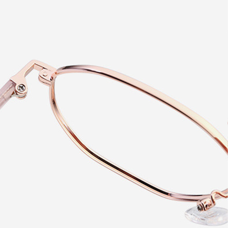 The frame structure is primarily crafted from a thin, polished metal alloy, likely titanium or a similar lightweight and durable material. The metal finish is smooth and even, thanks to a plated or coated surface that ensures longevity. The temple arms combine a metal core with a smooth plastic/acetate outer coating, providing both comfort and flexibility. The clear nose pads, likely made of silicone or plastic, offer lightweight, non – slip comfort during wear.