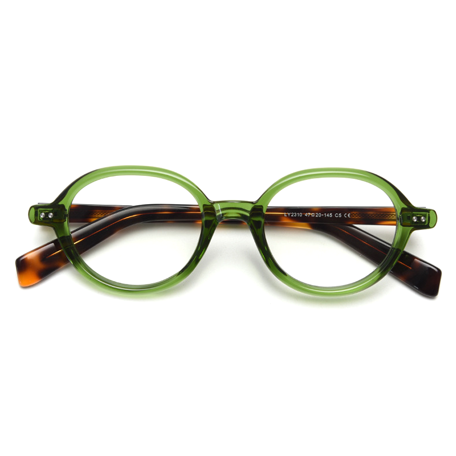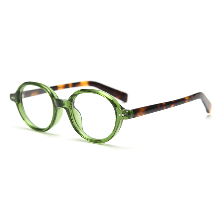 Some models have transparent green frames with tortoiseshell temple arms, while others feature solid black with metallic accents. The clear lens area emphasizes the customization for corrective use, balancing retro charm with modern durability.