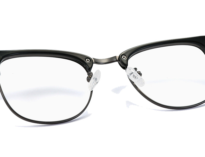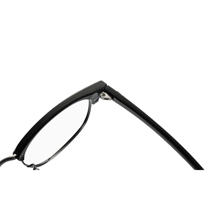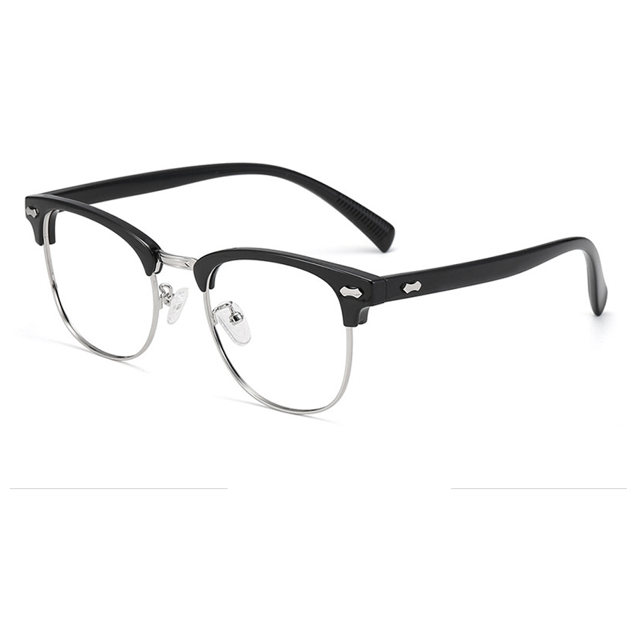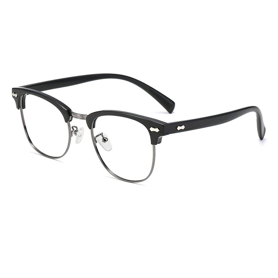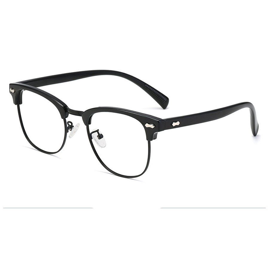 The frame front’s top bar is crafted from thick, durable plastic (acetate or similar), providing rigidity and a touch of style. The lens rims are made of a lightweight metallic alloy, such as stainless steel or titanium, which not only offers strength but also reduces the overall weight of the glasses for extended wear. The temple arms are a combination of plastic for structure and a textured rubber/plastic coating for a better grip and enhanced comfort. The clear plastic or silicone nose pads are soft, skin – friendly, and adjustable, ensuring pressure – free support.