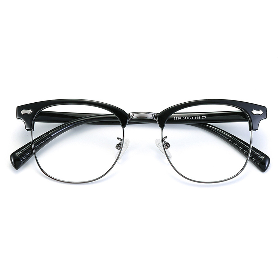 Available in a range of stylish colors including Black Silver, Black gunmetal, Bright Black, Gray gunmetal, and White, these eyeglasses can suit various tastes and outfits. The clubmaster style, with its thick plastic top bar and thin metal lower rim, creates a unique vintage – modern aesthetic. The temple near the ear has a ribbed/knurled texture for an anti – slip grip, and some black frames feature small, bone/arrow – shaped cutouts on the plastic front for added style.
