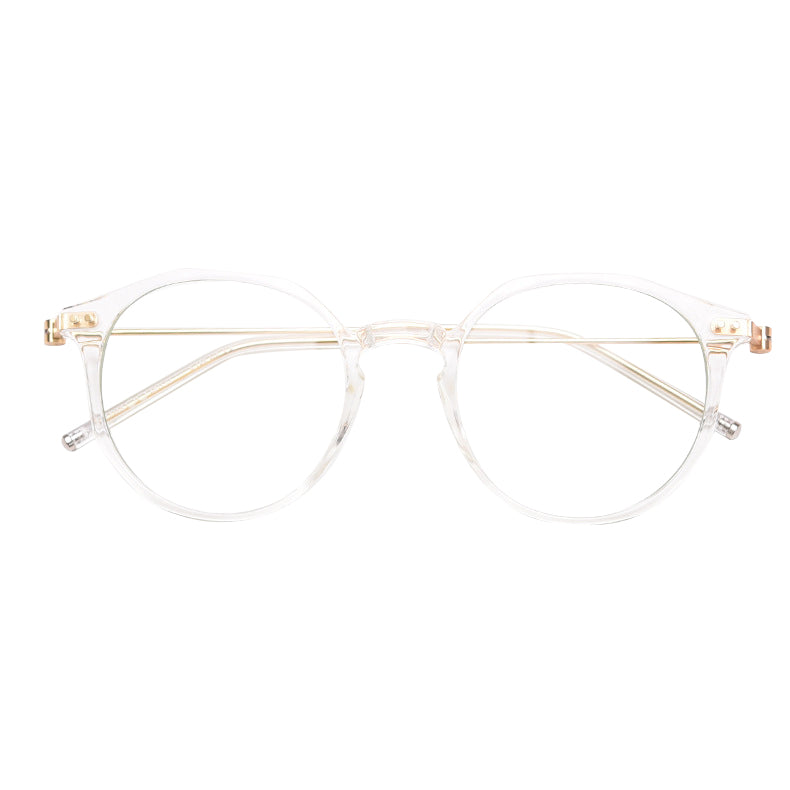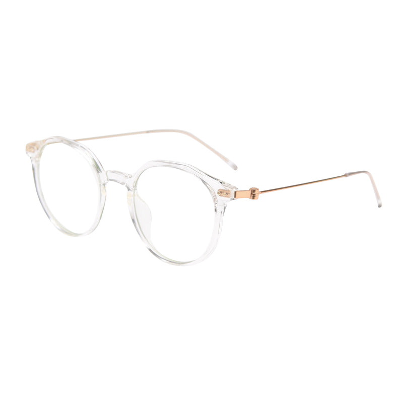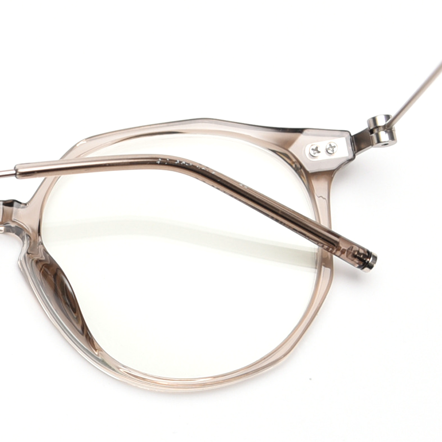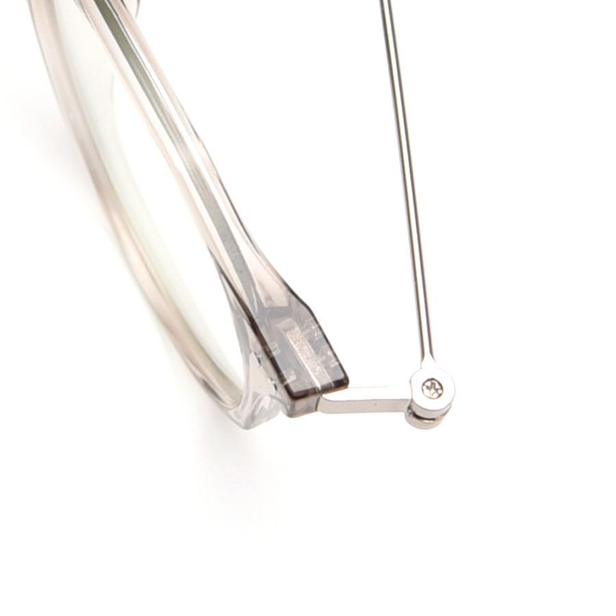 The frame front is crafted from a semi – transparent or transparent plastic material, likely acetate or TR90, which is lightweight, flexible, and durable. The temples are made of thin metal, such as stainless steel or titanium alloy, providing strength and a sleek look. The thin metal bridge between the lenses not only reinforces the structure but also maintains a minimalist aesthetic.