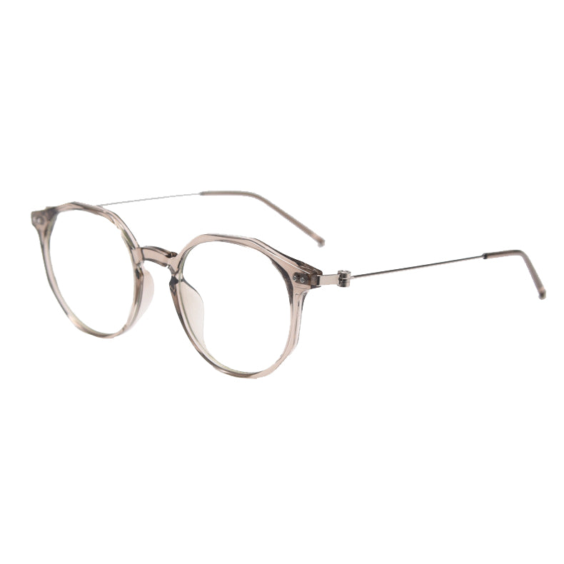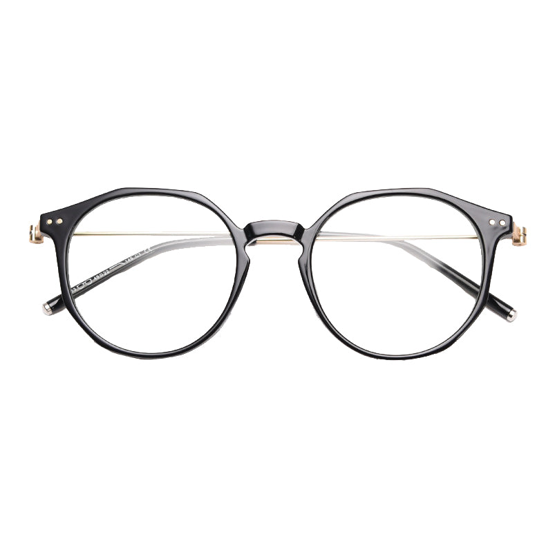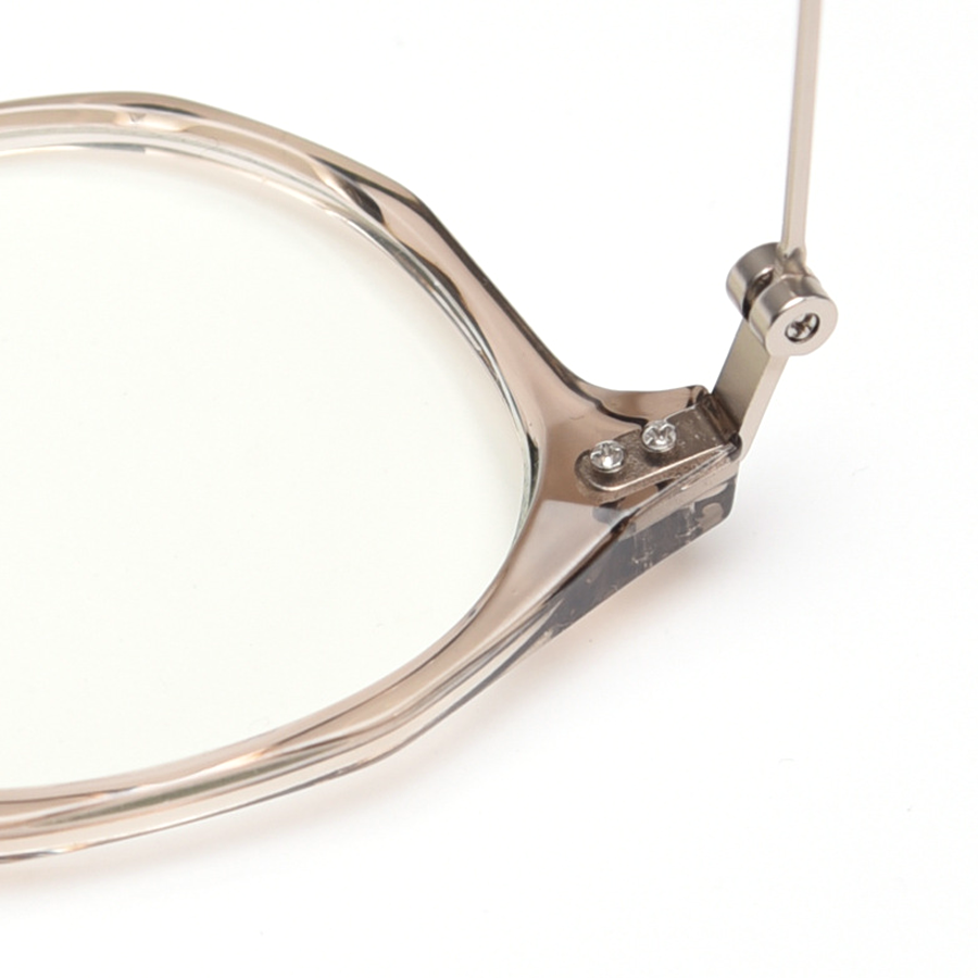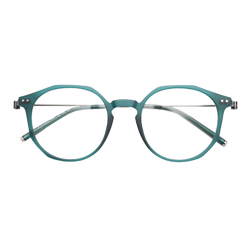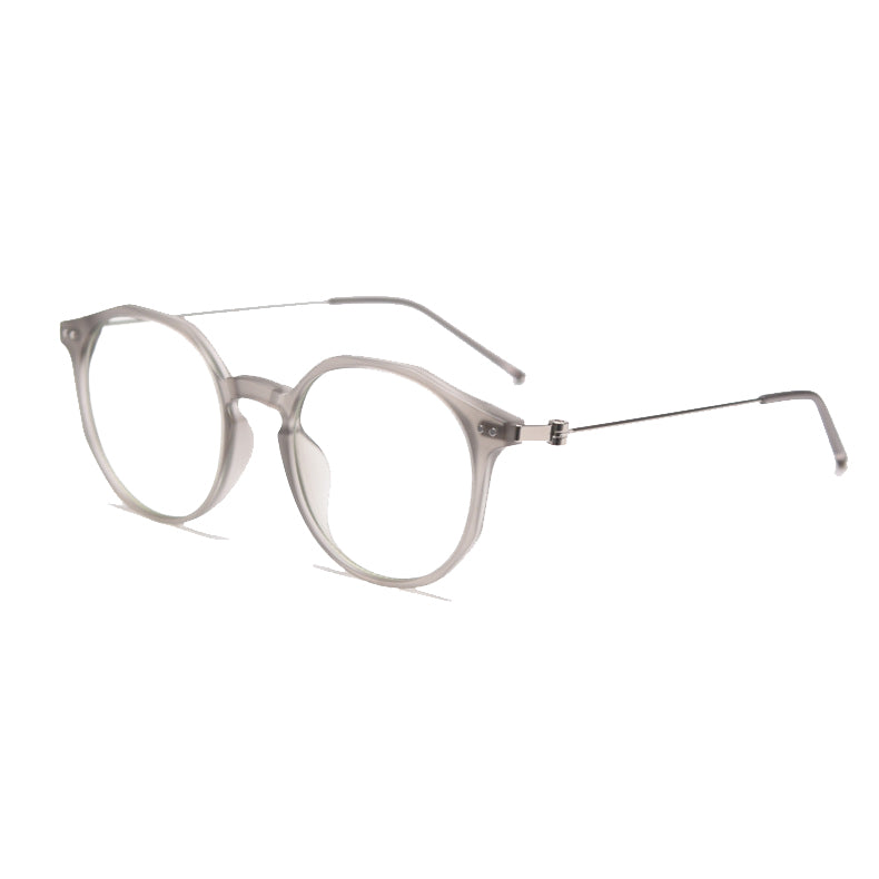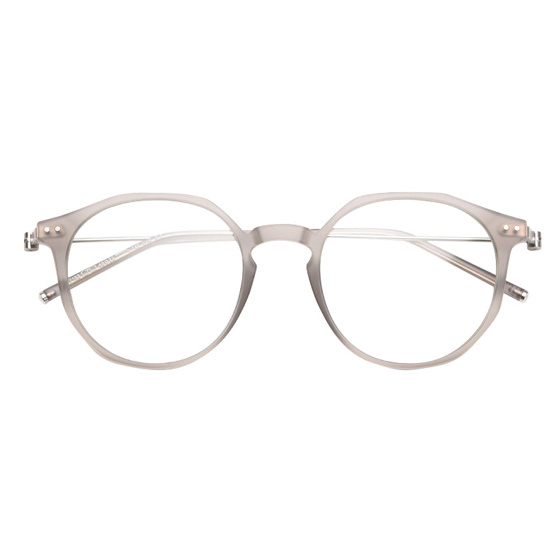 Available in a wide range of captivating colors including Black, Bright Gray, Green, Matte Gray, Tawny, Tortoise, and White, you can easily find a pair that matches your personal style. The design features round lenses with a slightly angular top edge, creating a unique hybrid round/hexagonal silhouette. There are small metal rivets/screws on the temples for both decoration and functionality, and the smooth, polished finish on both plastic and metal components gives it clean, modern lines.