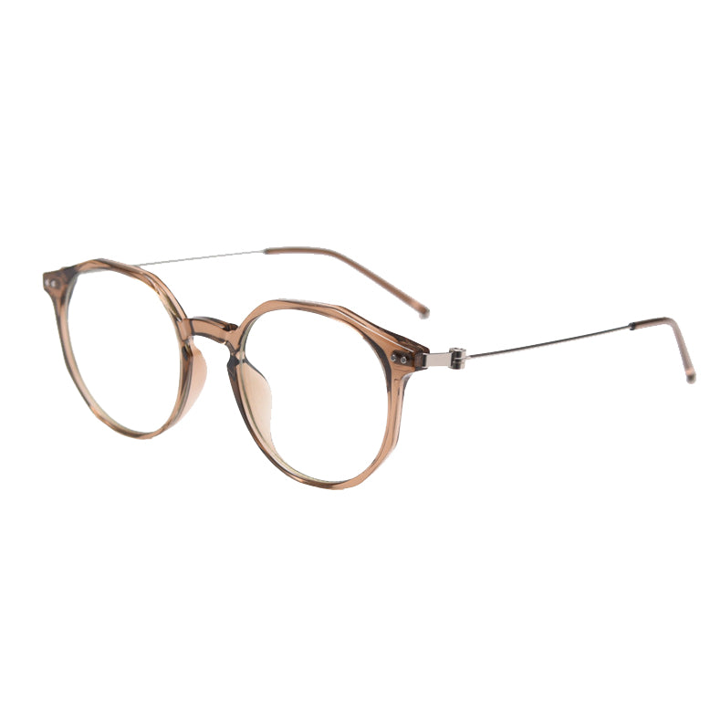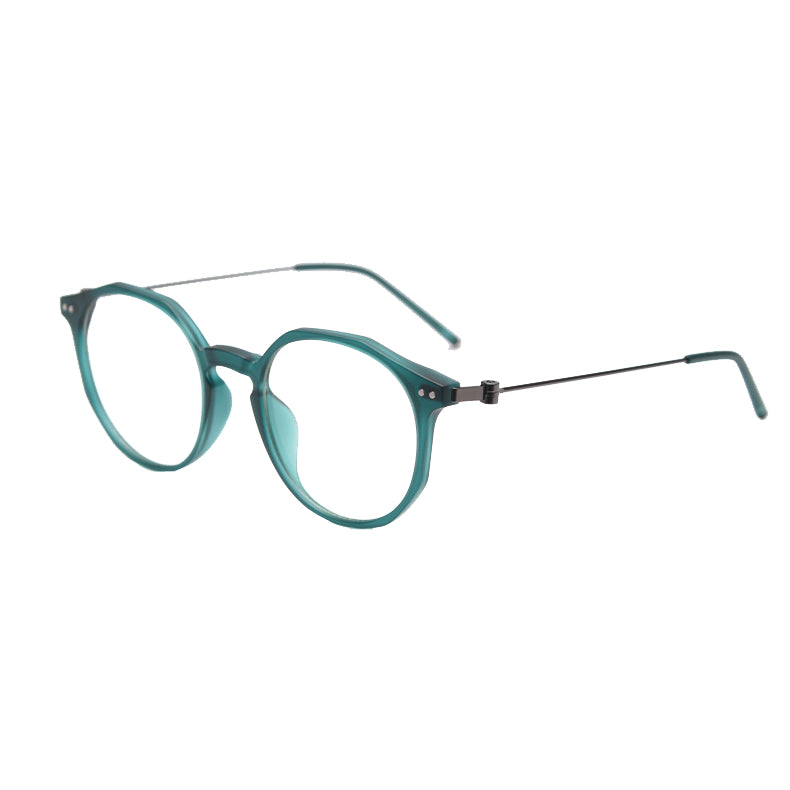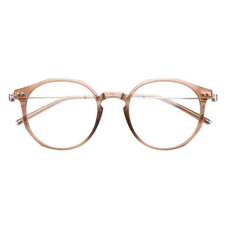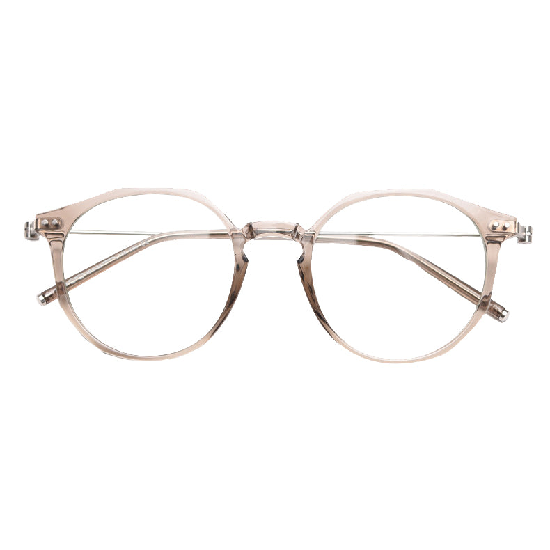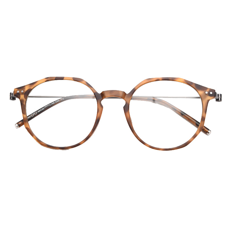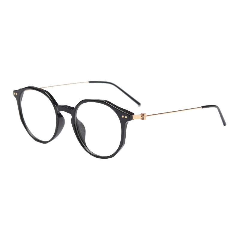 Available in a wide range of captivating colors including Black, Bright Gray, Green, Matte Gray, Tawny, Tortoise, and White, you can easily find a pair that matches your personal style. The design features round lenses with a slightly angular top edge, creating a unique hybrid round/hexagonal silhouette. There are small metal rivets/screws on the temples for both decoration and functionality, and the smooth, polished finish on both plastic and metal components gives it clean, modern lines.