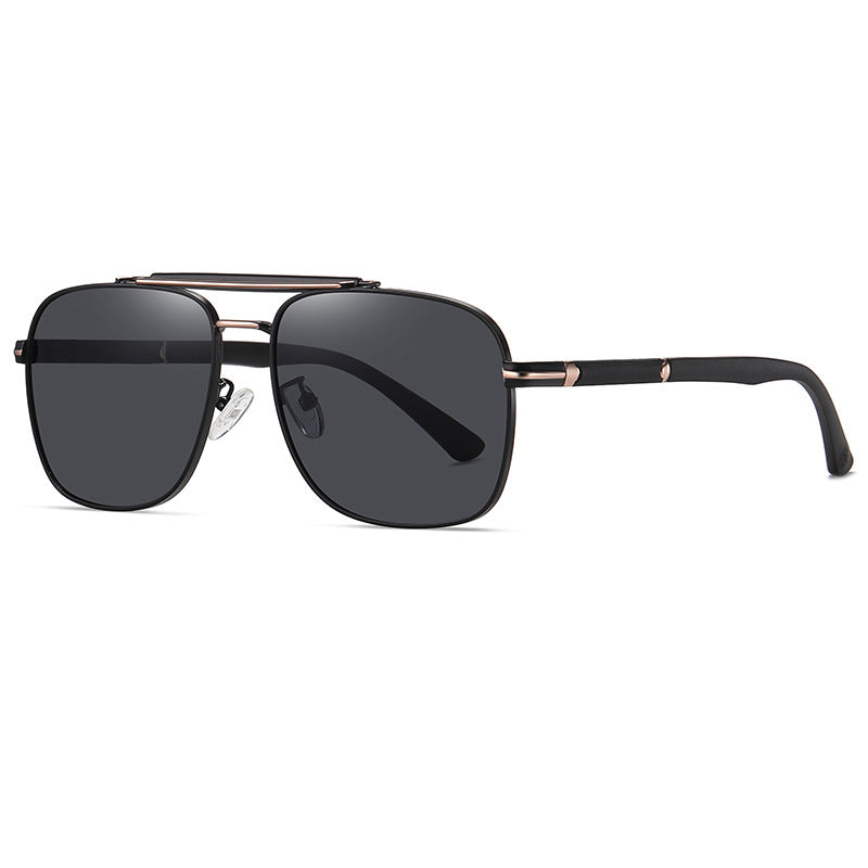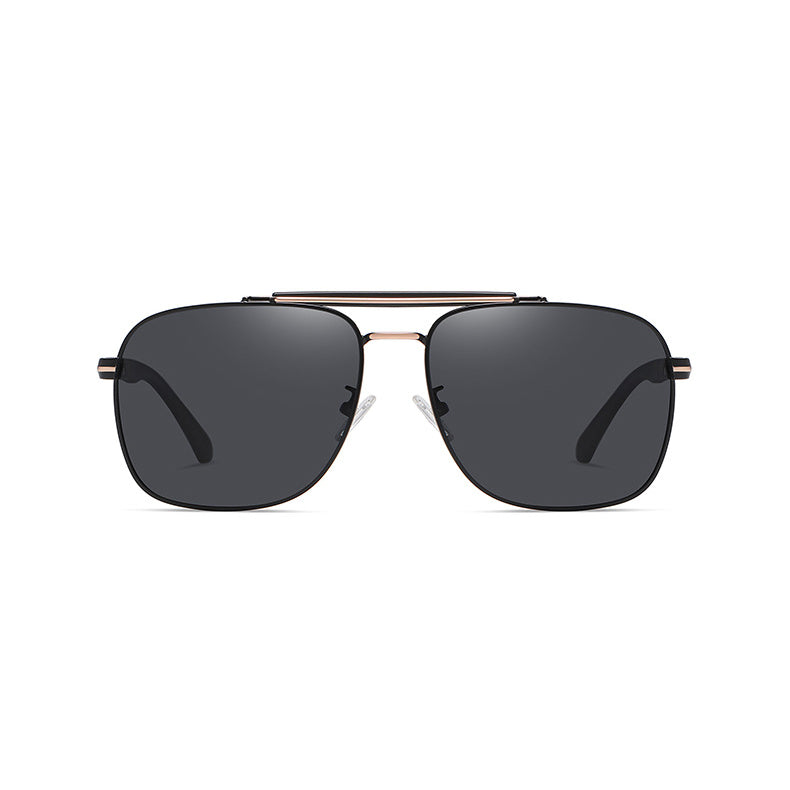 These sunglasses have a distinctive double horizontal bridge bar at the top, a classic aviator feature. The smooth metal frame edges and curved temple arms with matte – black finishing and metallic connectors add a touch of luxury. They are sized medium to large, with a lens width of approximately 55–60mm for broad eye coverage and a temple length of at least 130mm, typical of adult – sized sunglasses.
