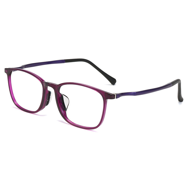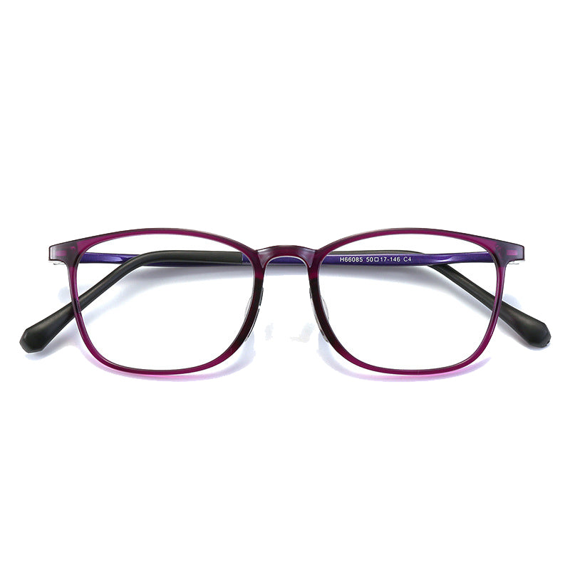 Available in multiple color options, including Black, Bright Black Gray, Matte Black Gray, Purple, and Red, you can choose the one that best suits your personal style. The purple and red frames feature a gradient or two-tone effect, adding visual interest, while the black frames come in both glossy and matte finishes, offering a sleek and modern aesthetic or a polished look respectively. The frames have a rectangular/square shape with rounded edges, a classic and versatile style that suits both casual and formal settings. The temples are two-tone, and there are subtle metallic (silver or chrome) accents near the hinges for a refined appearance.