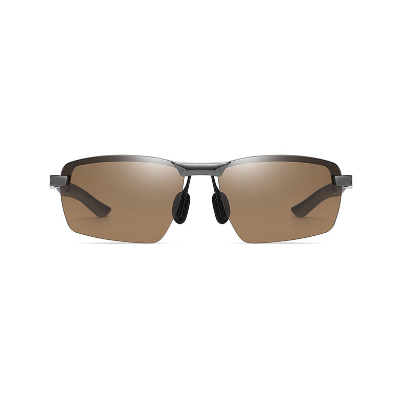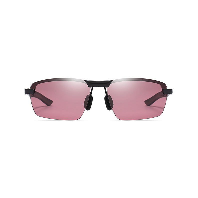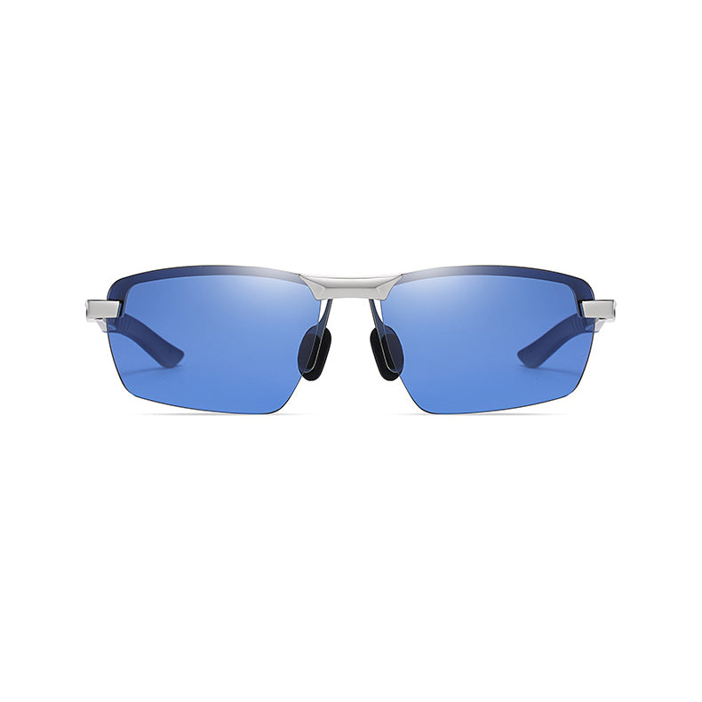 Available in a variety of colors, you can choose from black and silver/gray metallic frame colors, each with a smooth, matte or brushed finish for a premium look. The lens colors come in pinkish – red, brown, dark gray/black, and blue, catering to different light conditions and personal style preferences. The semi – rimless design holds the lenses with thin metal bridges and side frames, creating an open and lightweight appearance. The rectangular lenses have slightly rounded edges, paired with angular, aerodynamic temples for a sporty aesthetic. The earpieces feature subtle grooves or ridges for an anti – slip grip, and there are cut – out sections on the temples for ventilation or weight reduction.