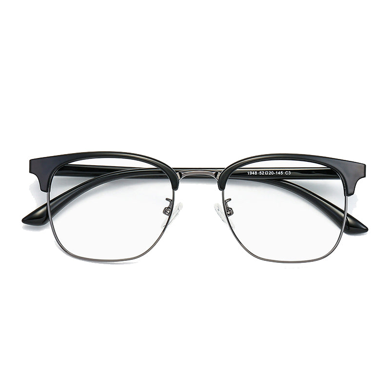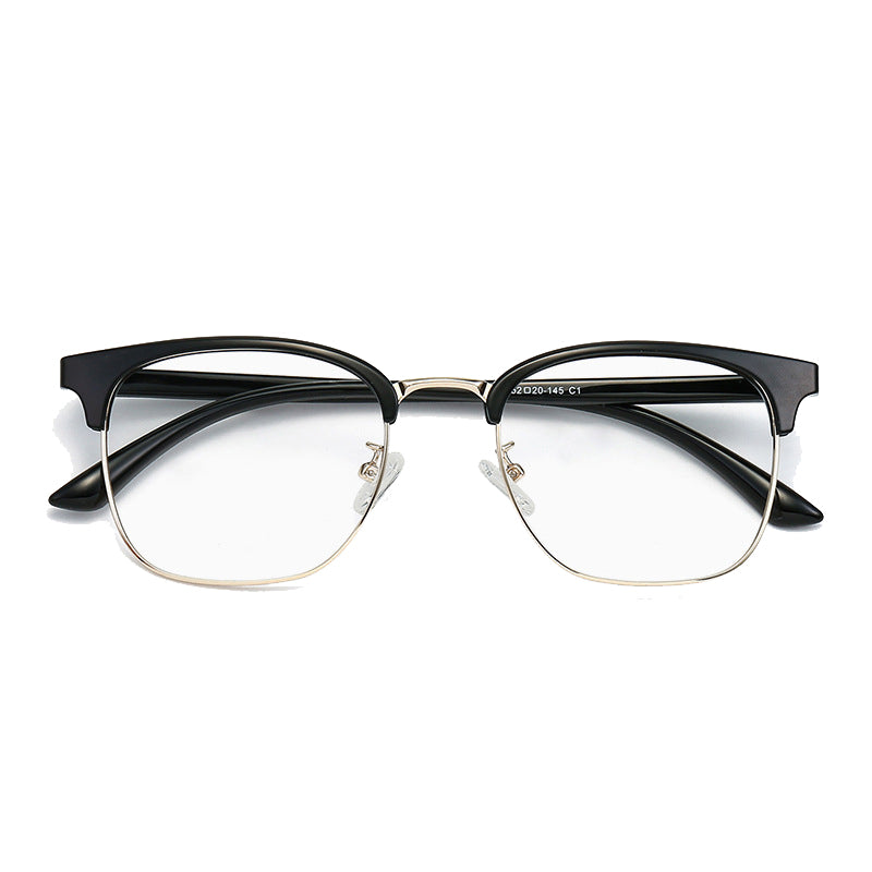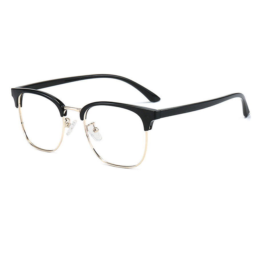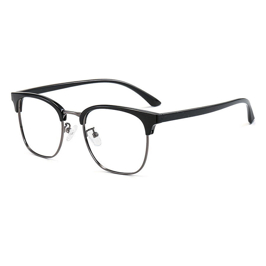 The frame features a distinctive browline/bifocal – style design. The top brow bar and temple arms are crafted from durable, lightweight plastic or acetate, available in finishes like matte or glossy. The dominant color of the plastic parts is black, giving it a sophisticated and timeless look. Meanwhile, the lower lens rims and connecting hinges are made of metal, likely stainless steel, with options of gold – plated, silver – plated, or gray metal for a touch of elegance and customization.