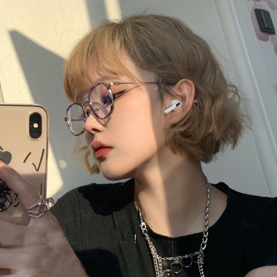 The frames are primarily made of metal, likely an alloy or titanium, which gives them a sleek, polished finish and a lightweight feel. The thin, delicate metal rims contribute to a minimalist, elegant look, while the decorative lines or notches on the temples near the hinge add subtle visual interest. The temples are thin and metallic with a smooth, durable finish, and some may have plastic/acetate tips for added comfort. The nose pads are clear, made of plastic or soft silicone, providing minimal weight and non – slip support.