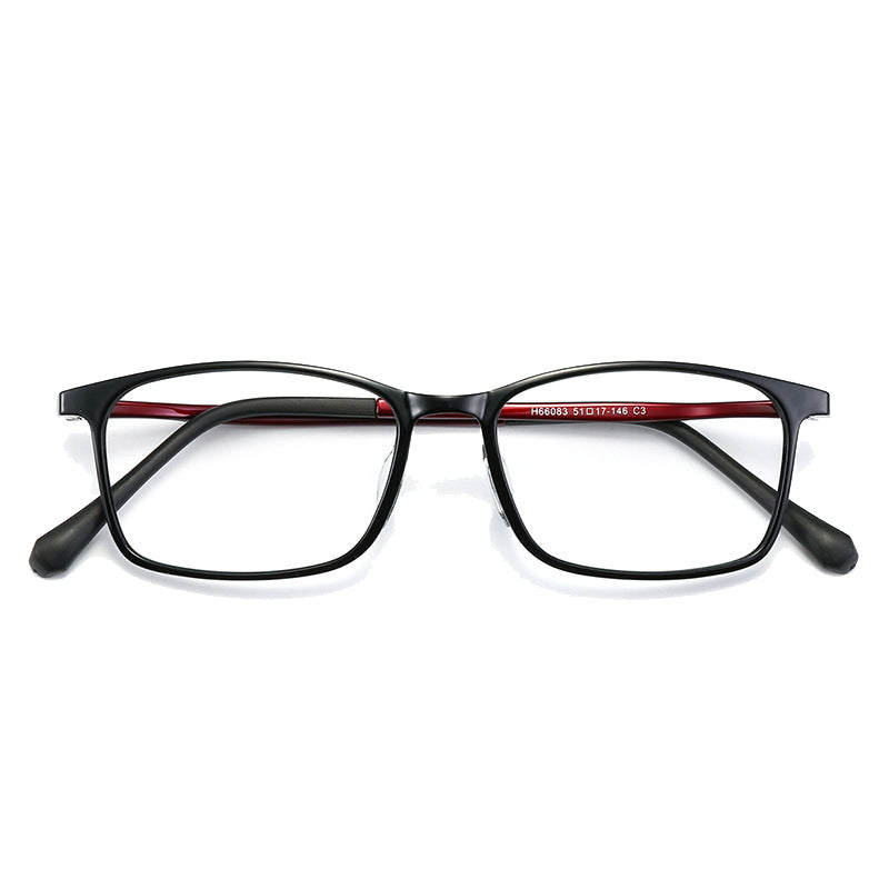 Available in a variety of color combinations, including Black, Black Blue, Black Grey, Black Purple, and Black Red, you can choose the one that best suits your personal style. The primary frame color is dominantly black, with contrasting colors on the temples adding a touch of visual interest. The rectangular frame shape has rounded edges (a soft square), making it a versatile design that suits most face shapes.