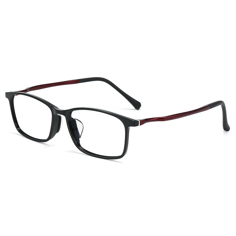 Available in a variety of color combinations, including Black, Black Blue, Black Grey, Black Purple, and Black Red, you can choose the one that best suits your personal style. The primary frame color is dominantly black, with contrasting colors on the temples adding a touch of visual interest. The rectangular frame shape has rounded edges (a soft square), making it a versatile design that suits most face shapes.