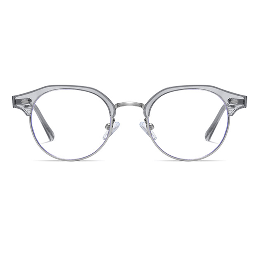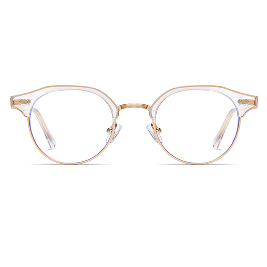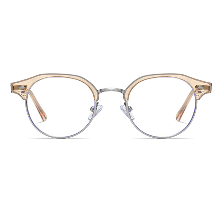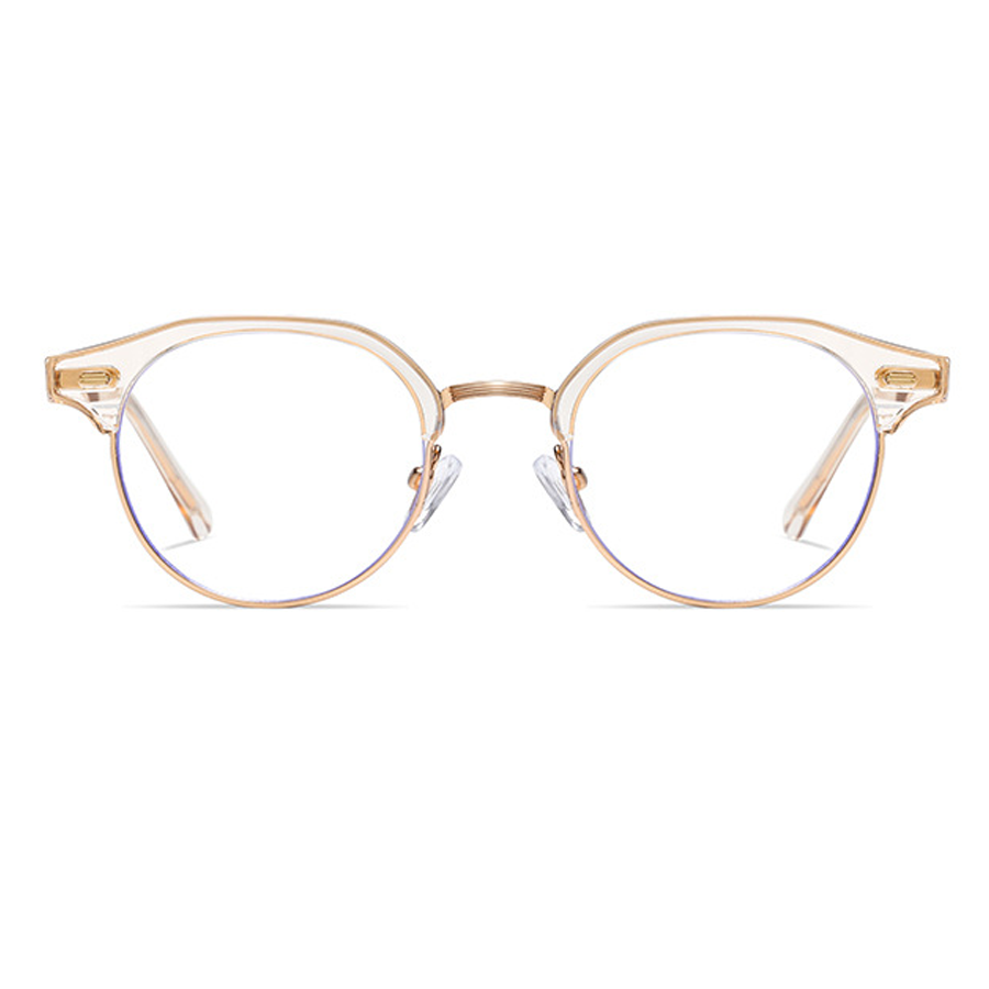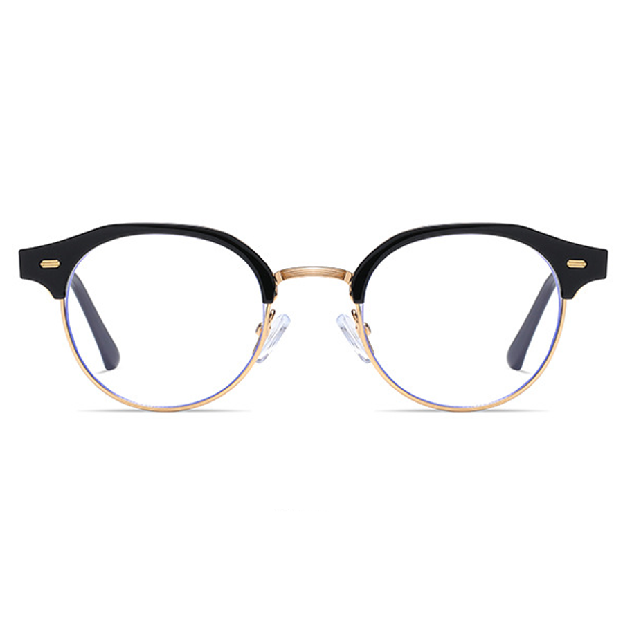 Available in a range of color schemes including Black + Gold, Clear (or Light Amber) + Gold/Silver, and Light Gray + Silver, as well as additional colors like White and Yellow, these eyeglasses cater to diverse style preferences. The round lens with a bold browline (thick top bar) and thin metal lower rim creates a unique retro – modern “clubmaster” or “browline” silhouette. There are subtle blue trims along the lens edges, indicating blue light filtering technology to reduce digital eye strain, and small gold/silver accents on the plastic brow bar for added detail.