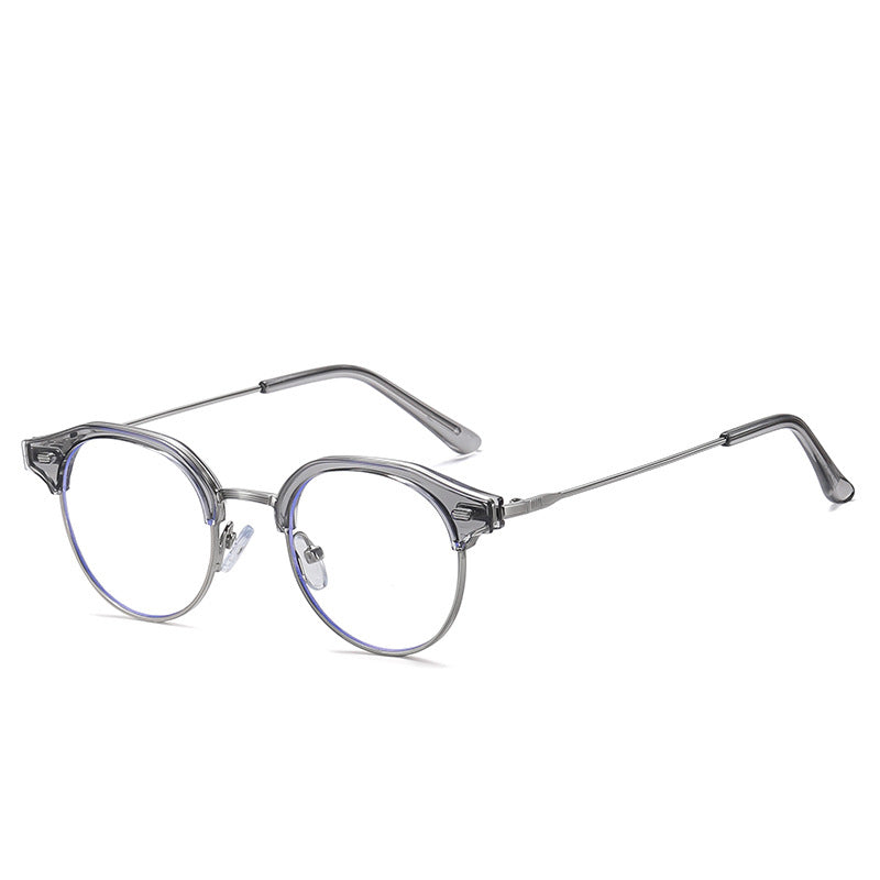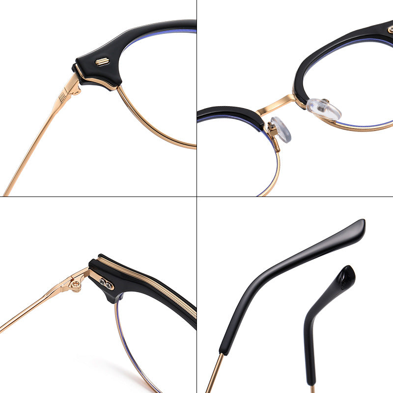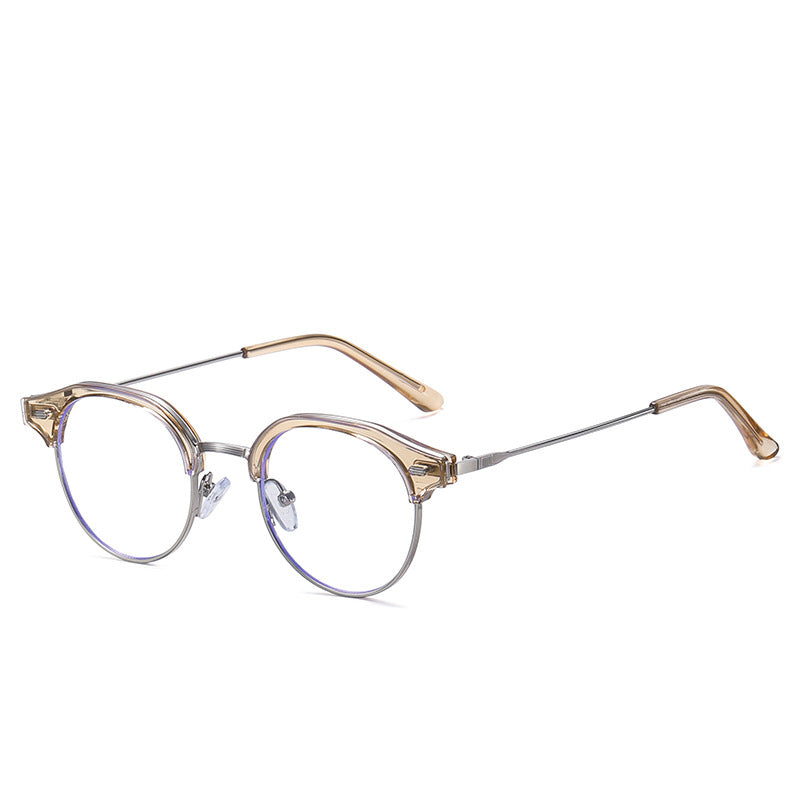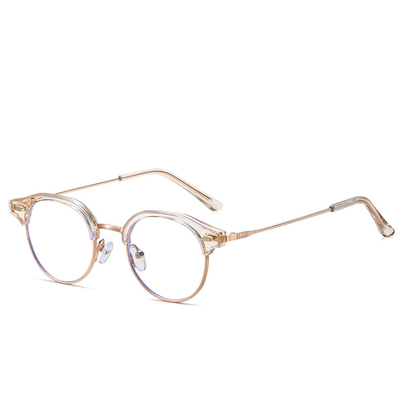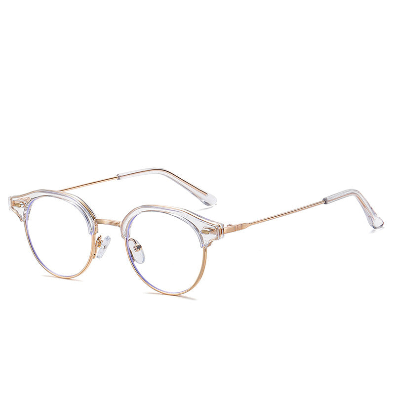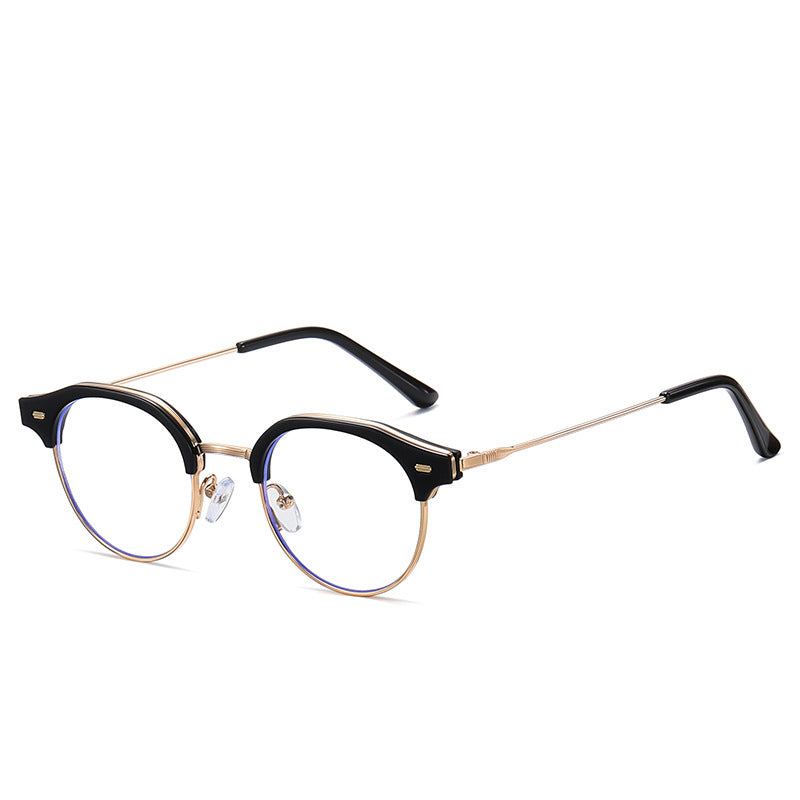 Available in a range of color schemes including Black + Gold, Clear (or Light Amber) + Gold/Silver, and Light Gray + Silver, as well as additional colors like White and Yellow, these eyeglasses cater to diverse style preferences. The round lens with a bold browline (thick top bar) and thin metal lower rim creates a unique retro – modern “clubmaster” or “browline” silhouette. There are subtle blue trims along the lens edges, indicating blue light filtering technology to reduce digital eye strain, and small gold/silver accents on the plastic brow bar for added detail.