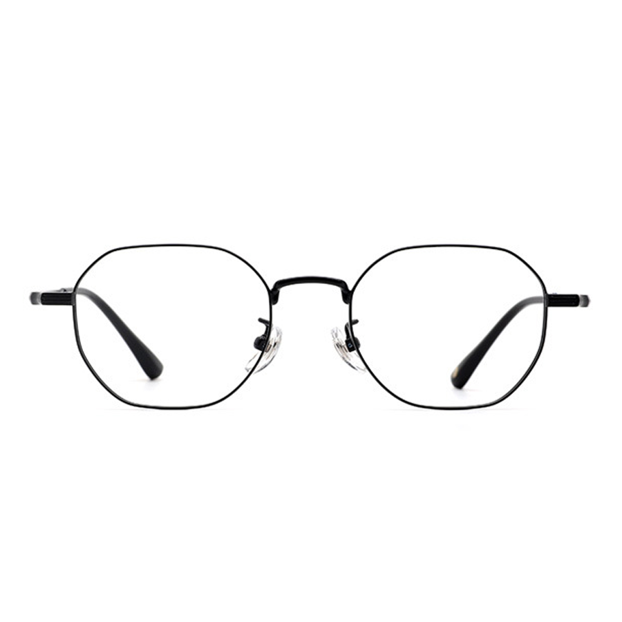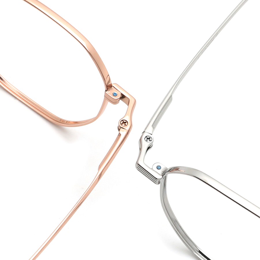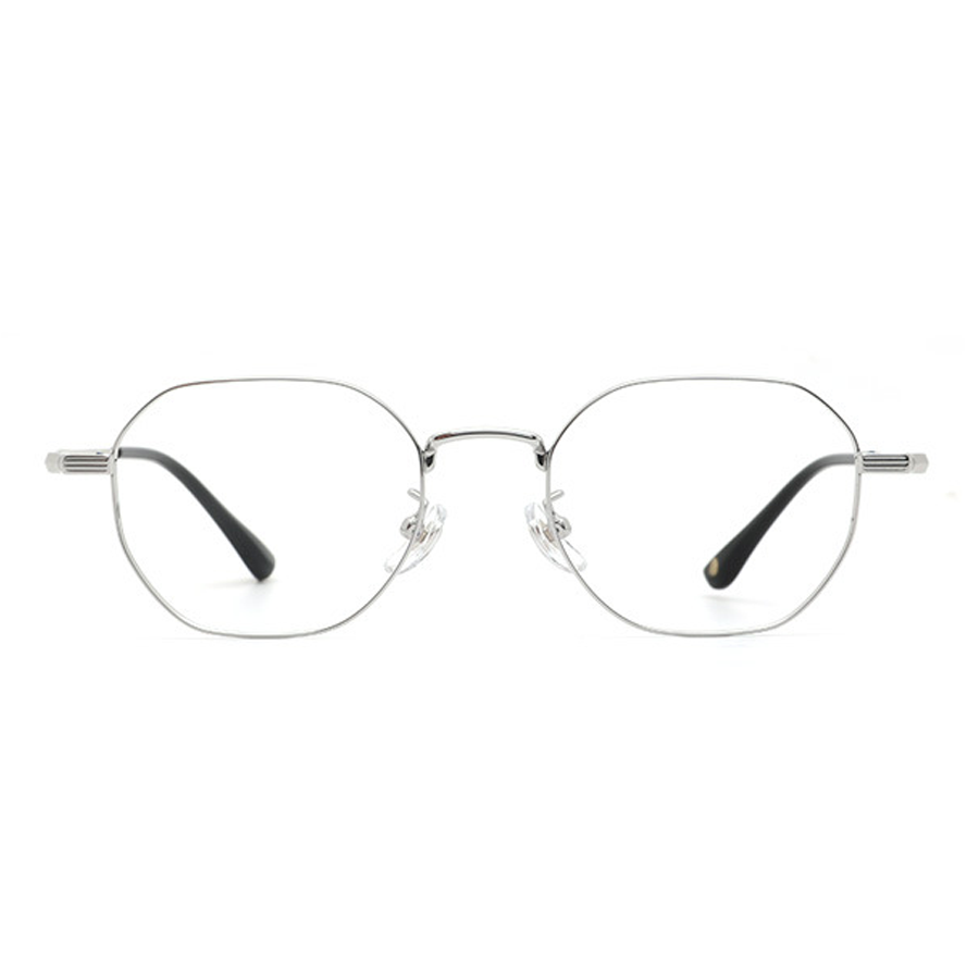 The hexagonal or octagonal lenses with rounded edges give these eyeglasses a modern, geometric appeal. The temple tips and nose pads are made of plastic or silicone, available in colors like pink, black, or white, providing both comfort and a stylish touch. The hinges and screws, also made of metal, are precision-engineered with small screws and blue accent dots, adding to the visual interest and ensuring high-quality assembly and durability.
