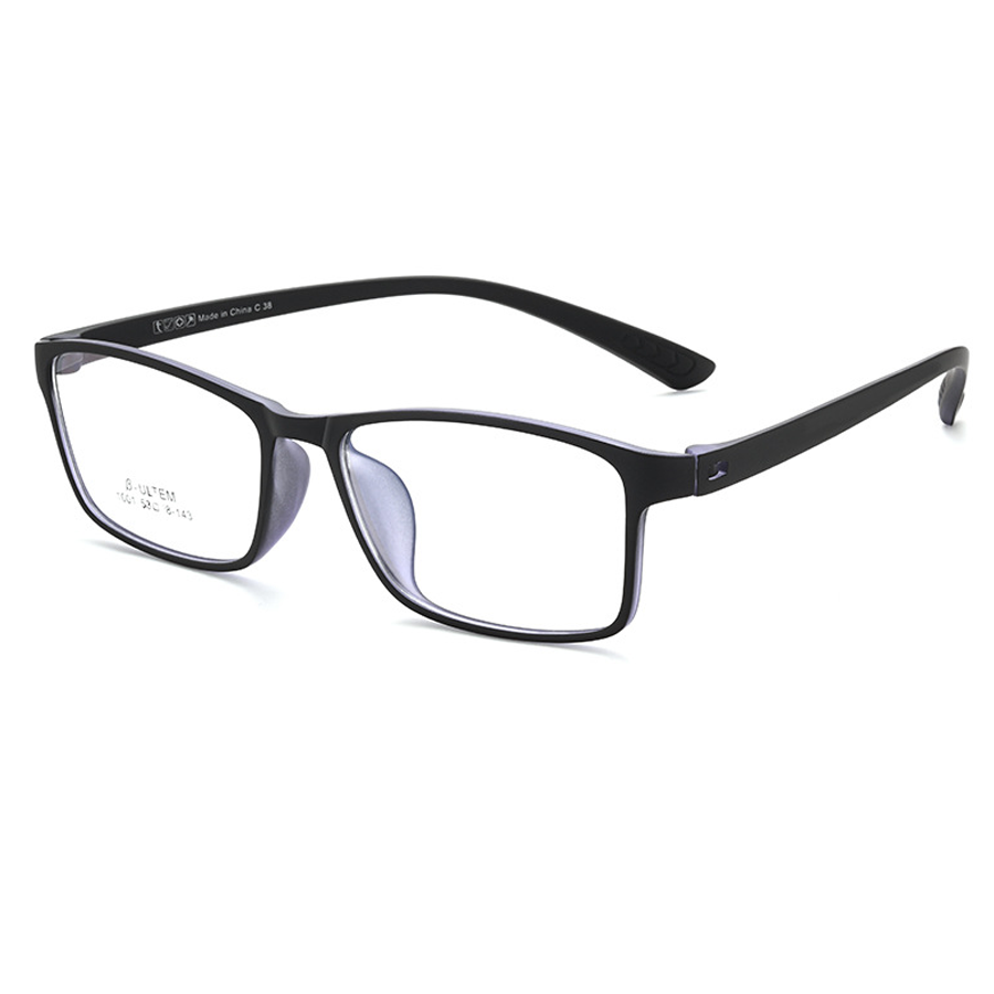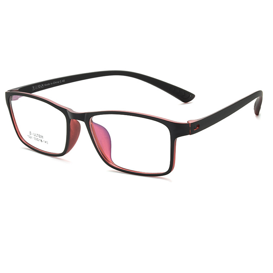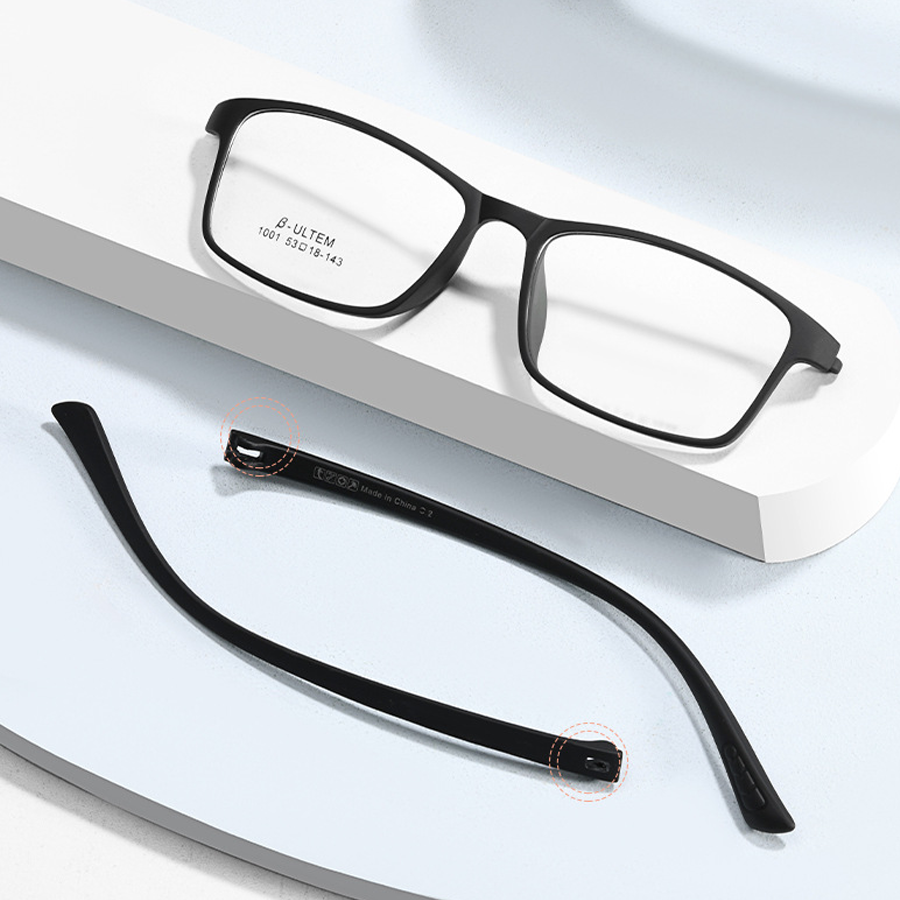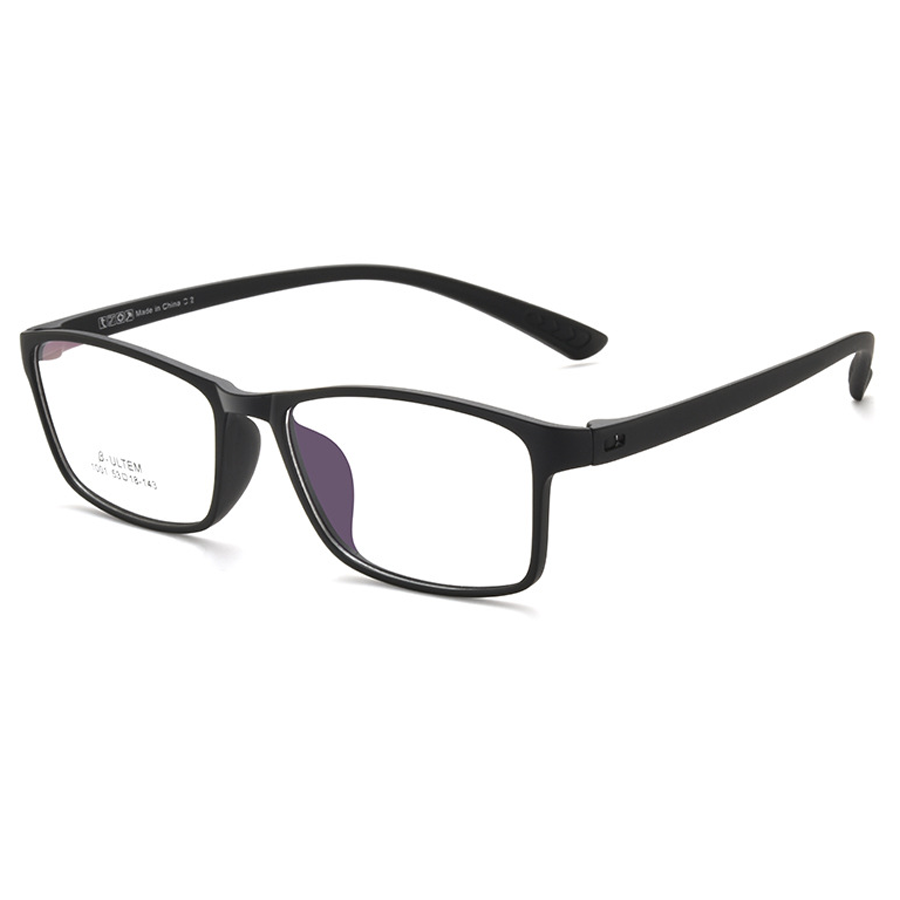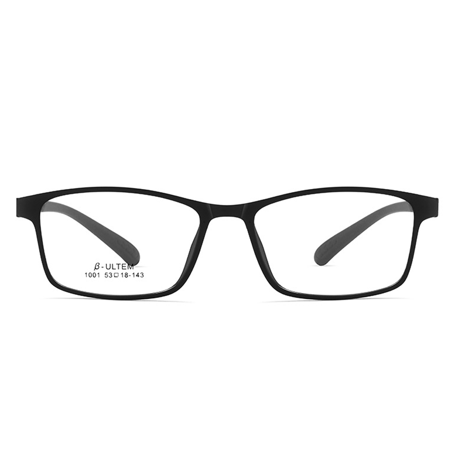 The rectangular shape with clean, straight lines offers a sleek, professional appearance. Brand/model text such as “B – ULTEM,” “1001 53□18 – 143” is printed on the inner lens wells. The temple tips are textured, curved for comfort, and have subtle ridges for a better grip. The ergonomic nose pads are rounded, soft, and attached to the bridge, providing all – day comfort and minimizing slippage.