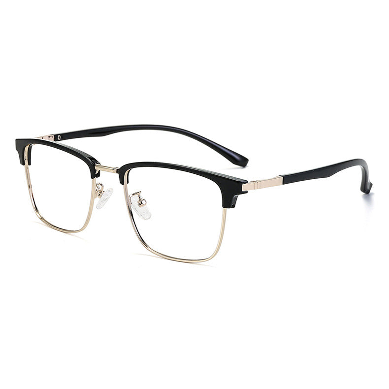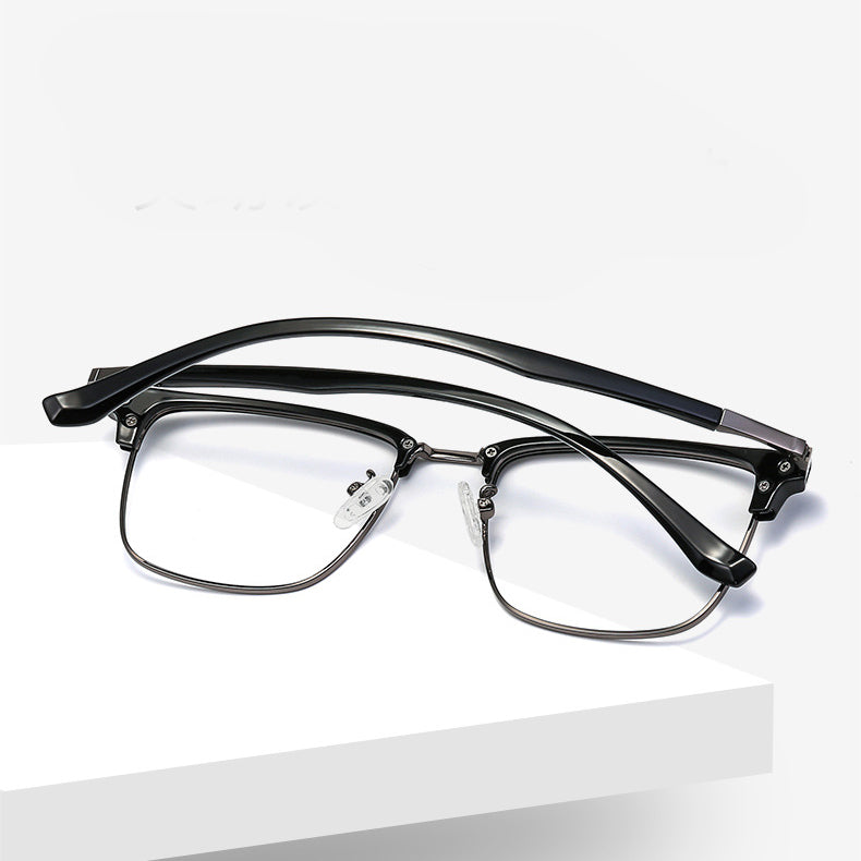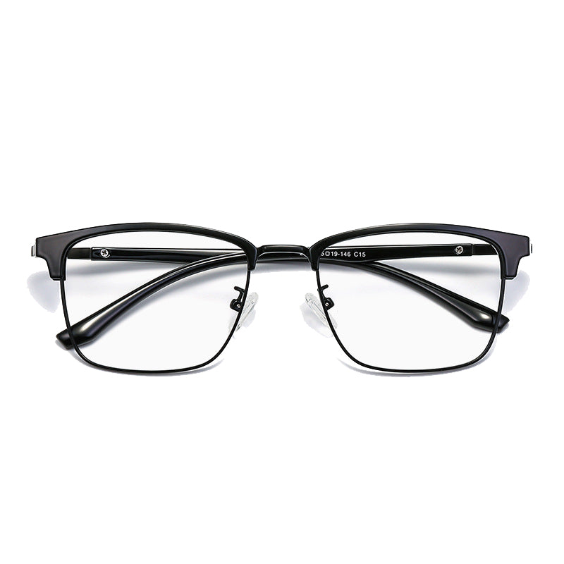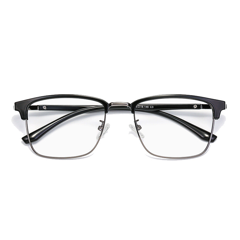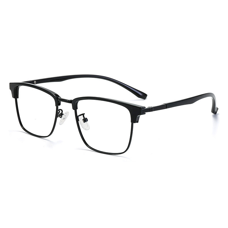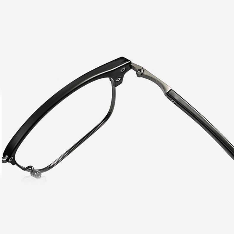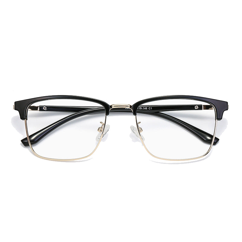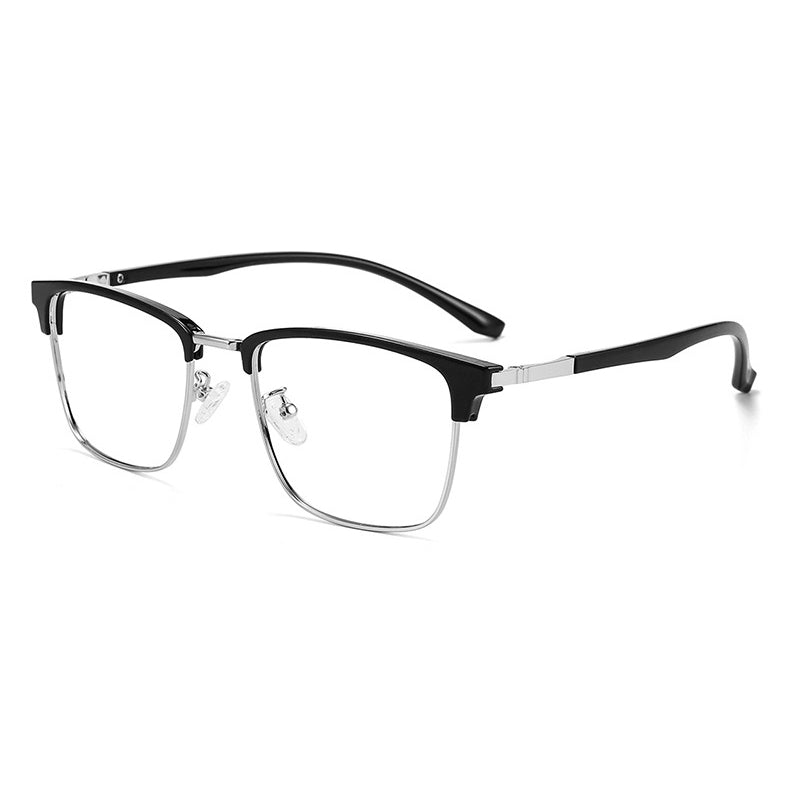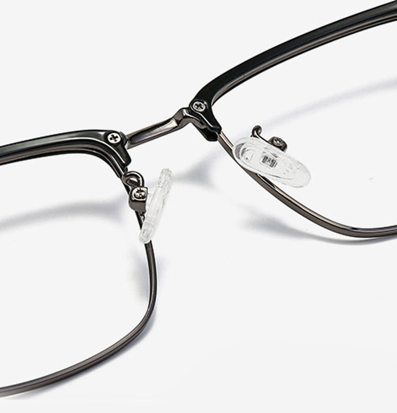 The frame of these eyeglasses combines two high – quality materials. The brow bar and temple tips are crafted from plastic/acetate, available in a sleek black finish with either a glossy or matte look. The eyewire (lower rim of the lens) and hinges are made of a lightweight, durable metal alloy, likely stainless steel, titanium, or a nickel – free alloy, presenting silver, gold, or gunmetal gray metallic accents. The transparent plastic nose pads offer comfort and support, and in some models, they can be screw – adjustable.