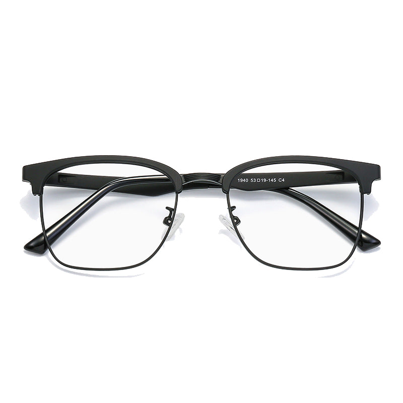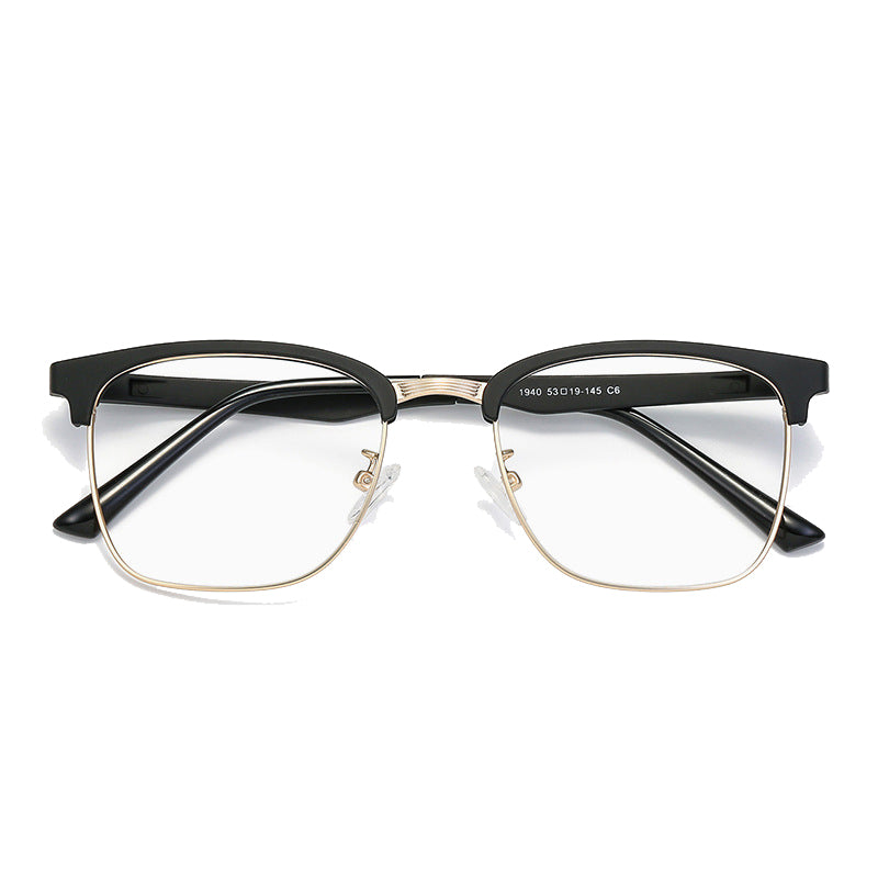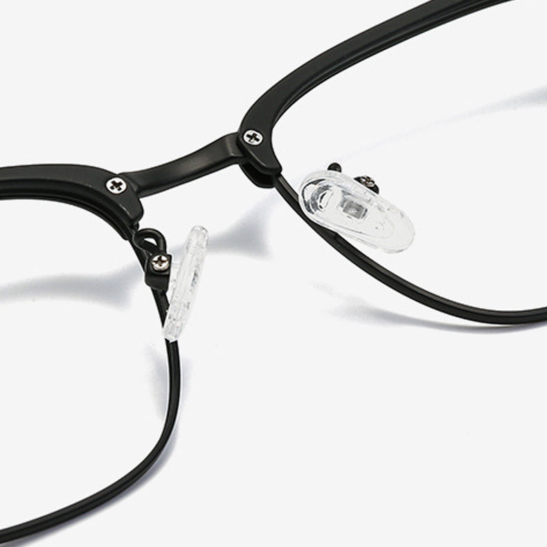 The top bar and arm segments feature a sleek matte black finish, crafted from either acetate or lightweight plastic. This material provides a smooth, non – slip texture with a uniform matte coating. The lens rims come in different metallic variants – gold, silver, or all – black, made of an alloy or stainless steel, presenting a polished and sophisticated look. The hinges and connectors are made of stainless steel or nickel alloy, ensuring smooth pivot movement and long – lasting durability. The nose pads are transparent, soft plastic or silicone, offering comfort and skin safety.