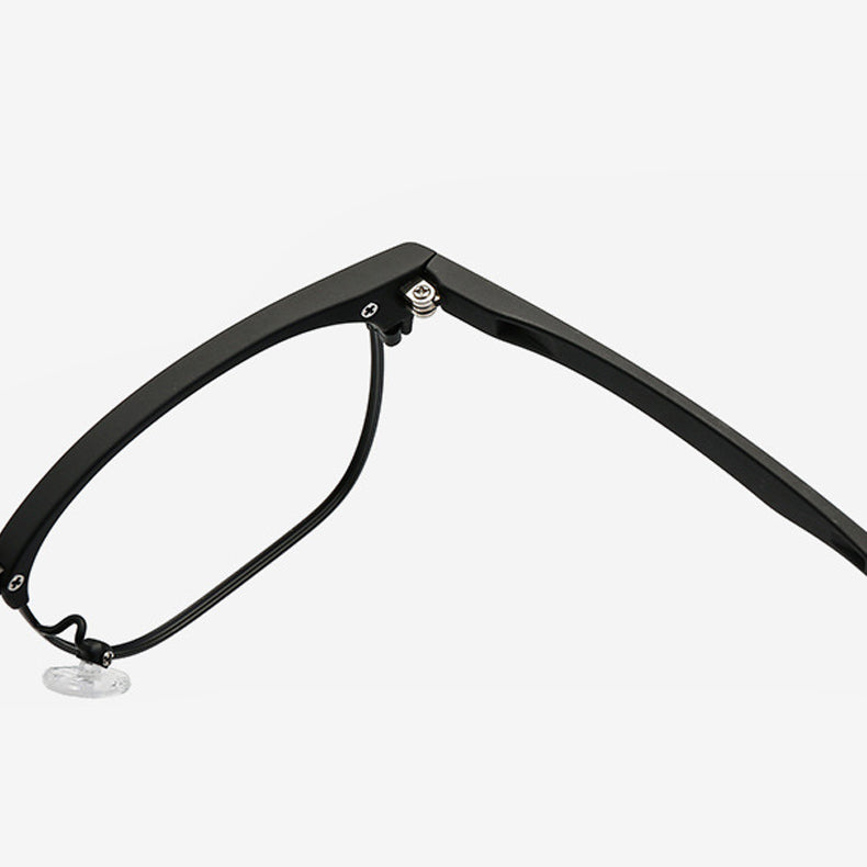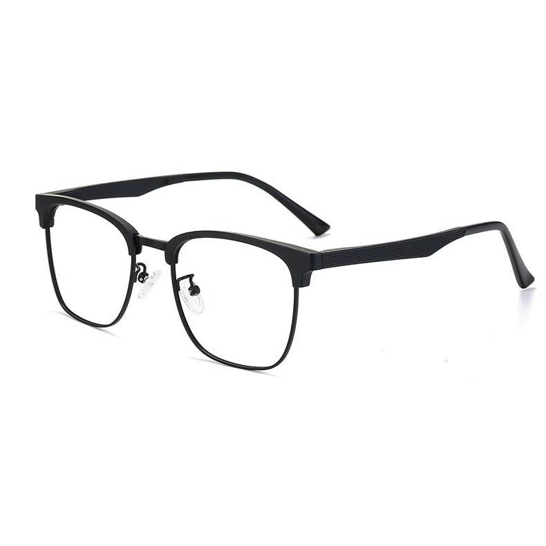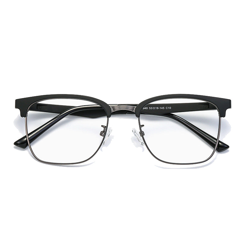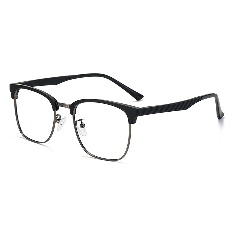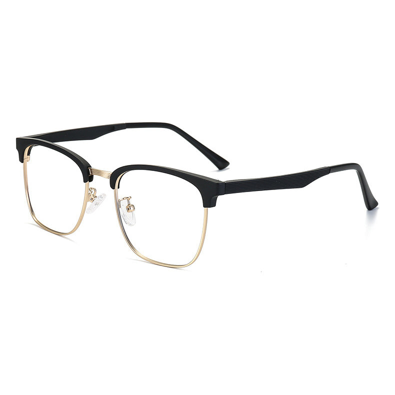 Available in multiple color combinations including Black, Black Gold, Black Gray, and Black Silver, you can choose the one that best suits your personal style. The glasses follow a browline/clubmaster design style, combining a solid black top bar with open – bottom metal lens frames for a semi – rimless aesthetic. The arms are curved and have a textured section near the end, which aids grip and prevents slipping. They are also foldable, making them highly portable for easy storage.