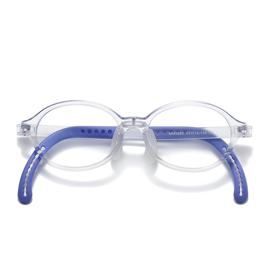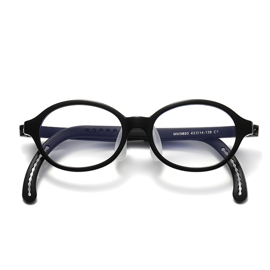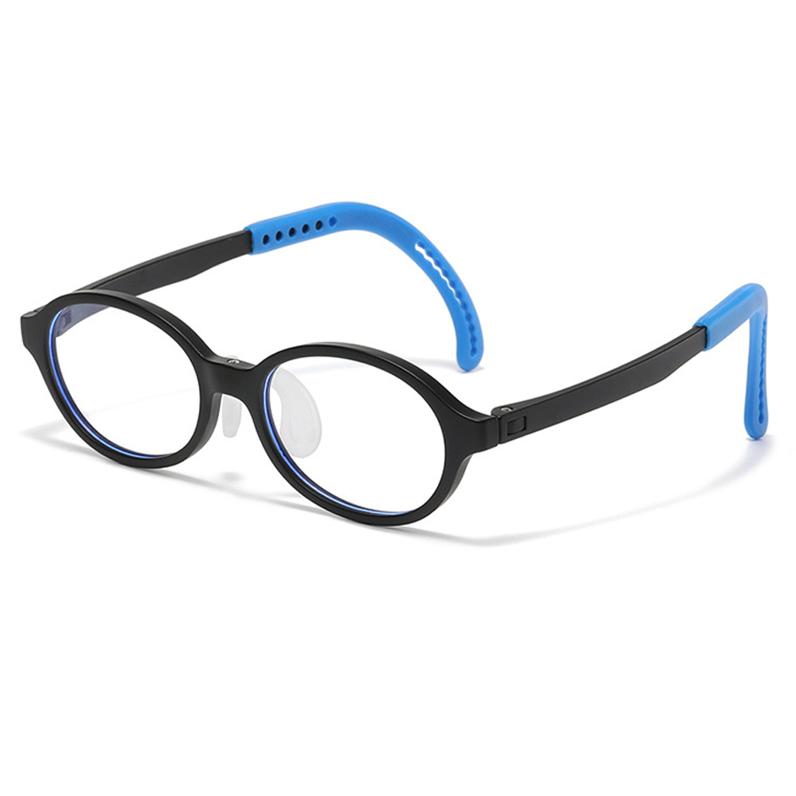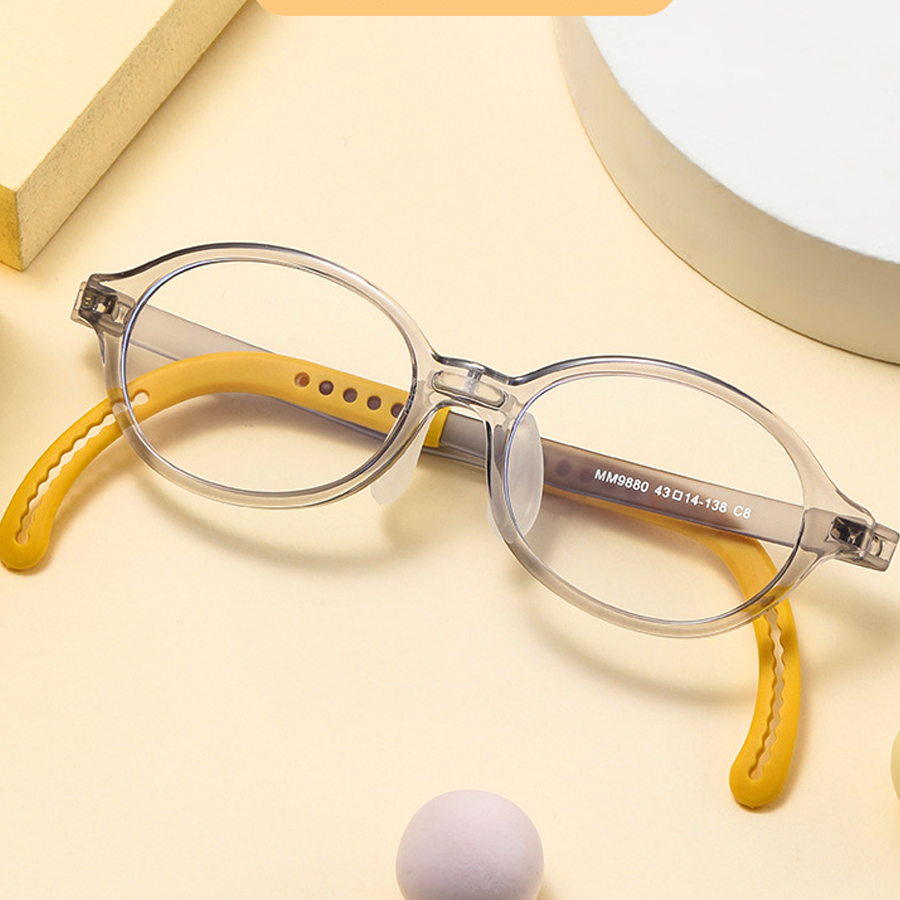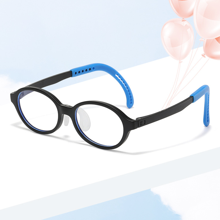 The lenses have a round/oval shape, with a width of approximately 43mm, a bridge width of 14mm, and an arm length of 138mm – all standard measurements for children’s frames. Some images show a subtle blue edge on the lenses, suggesting the presence of an anti-blue light coating, which helps protect children’s eyes from digital screen radiation. The adjustable nose pads and textured arm ends further enhance the comfort and fit of the glasses, ensuring they stay in place even during active play.