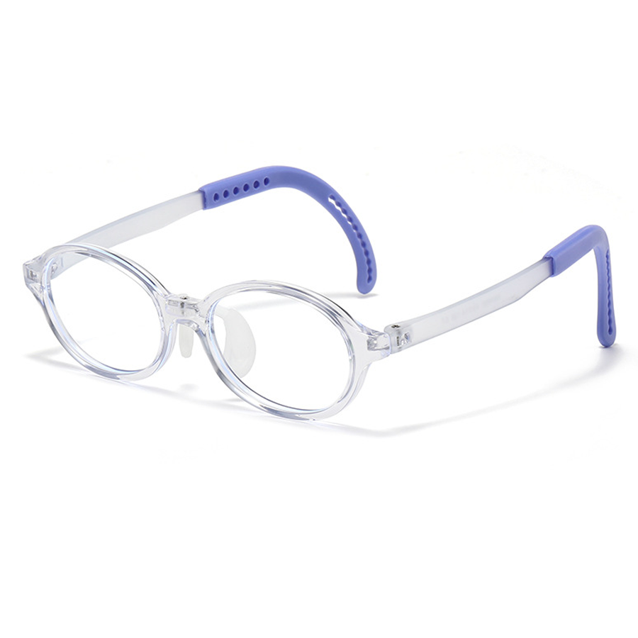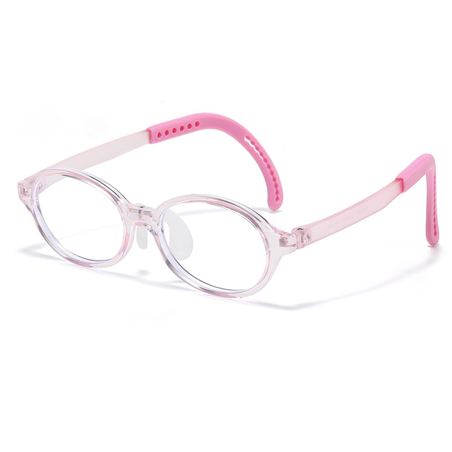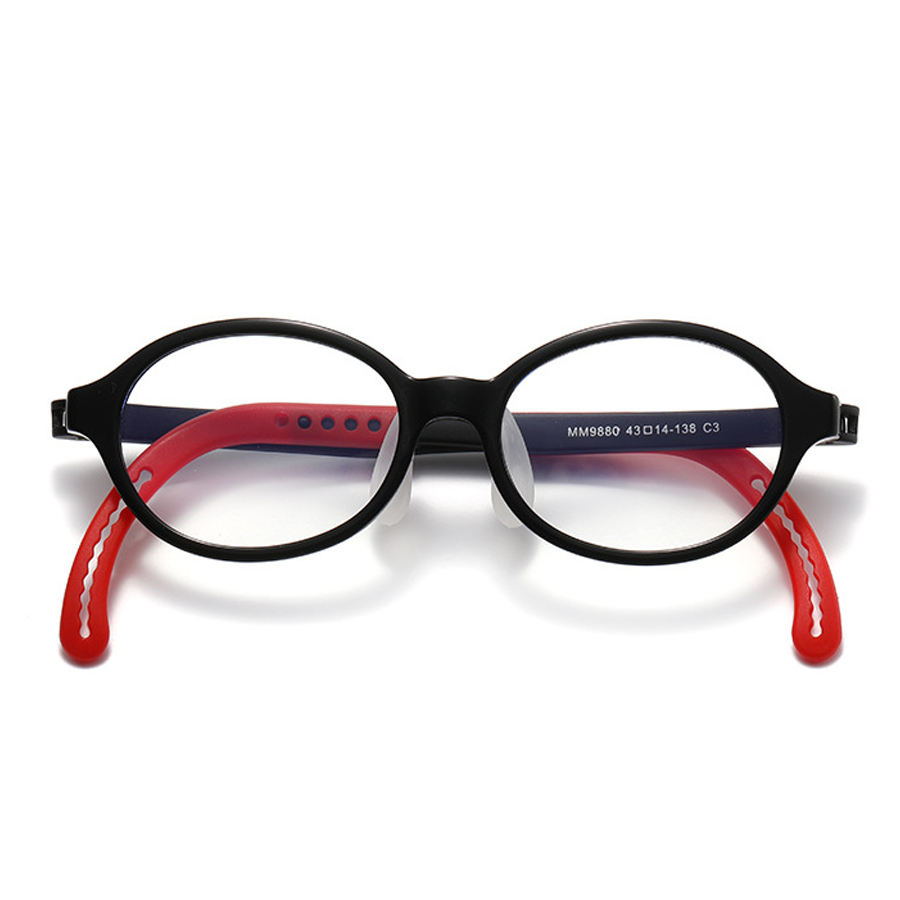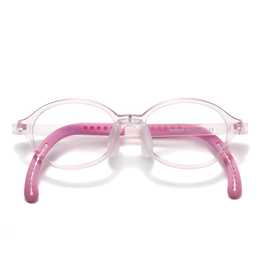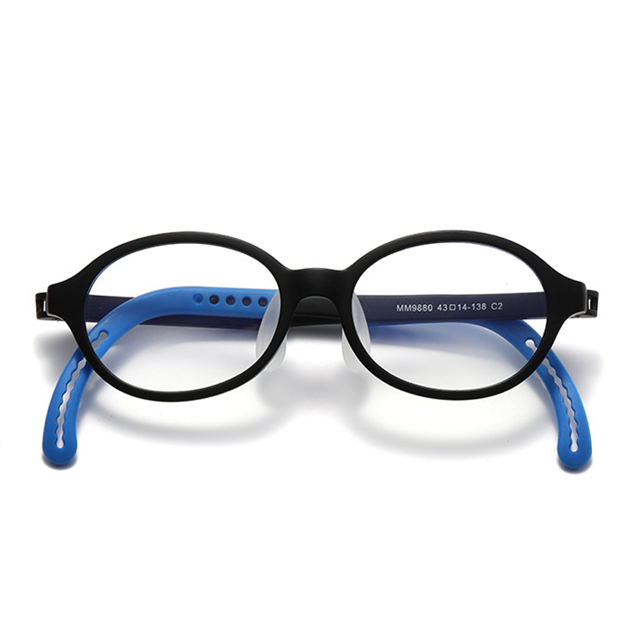 The lenses have a round/oval shape, with a width of approximately 43mm, a bridge width of 14mm, and an arm length of 138mm – all standard measurements for children’s frames. Some images show a subtle blue edge on the lenses, suggesting the presence of an anti-blue light coating, which helps protect children’s eyes from digital screen radiation. The adjustable nose pads and textured arm ends further enhance the comfort and fit of the glasses, ensuring they stay in place even during active play.