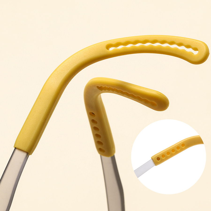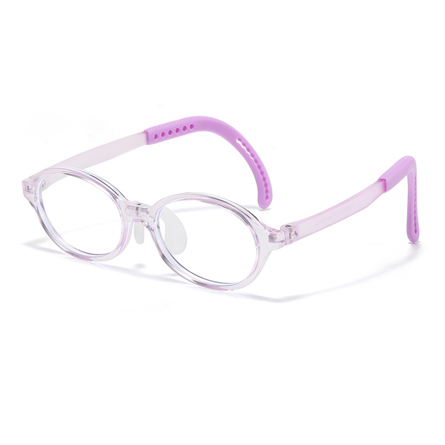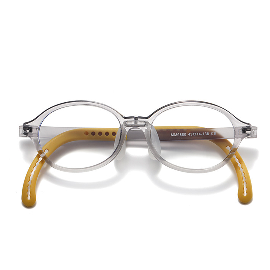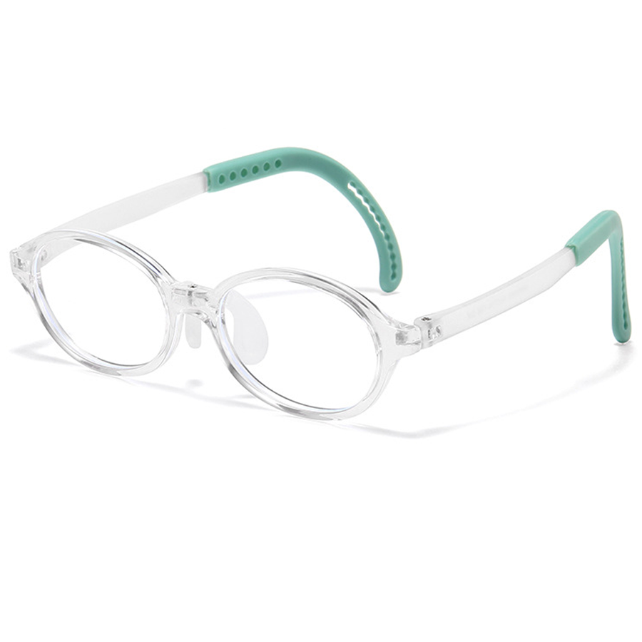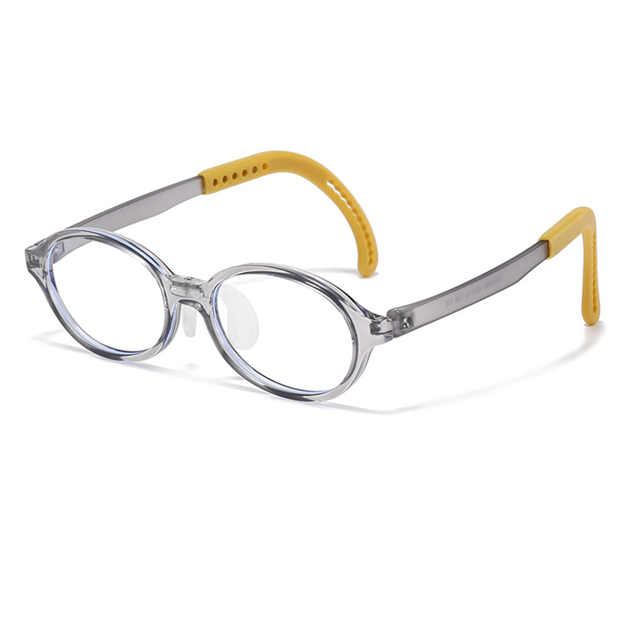 The frame is primarily made of a lightweight, flexible plastic, likely TR90 or a similar durable, impact-resistant polymer. This material not only reduces the overall weight of the glasses but also makes them ideal for kids who are constantly on the move. The nose pads are soft, white silicone pads, providing a comfortable and ergonomic fit while reducing pressure on the nose. The arms (temples) are a combination of smooth, lightweight plastic for structure and colored, textured accents in vibrant hues like teal, yellow, pink, blue, red, and black. These accents feature small circular dots and wavy/textured patterns on the arm ends, which are both aesthetically pleasing and functional for grip.
