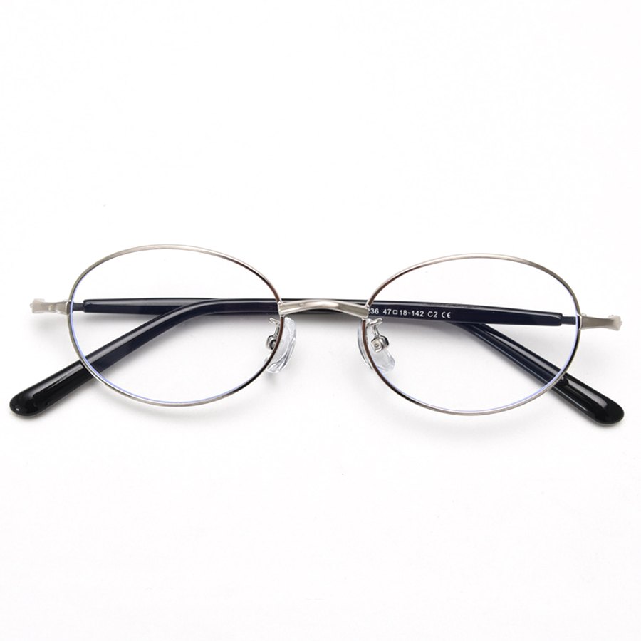 Design Elements Thin metal rims, clear plastic nose pads, metal hinges with visible screws, oval/round shape