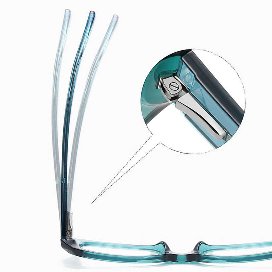 The frames of these eyeglasses are primarily crafted from lightweight plastic/acetate, which is not only durable and flexible but also comfortable for all – day wear. The temple and hinge areas feature metal components, likely stainless steel or nickel – plated, ensuring a secure attachment and long – lasting use. The hinges are adjustable, with visible metal screws that guarantee stability and the ability to customize the fit.