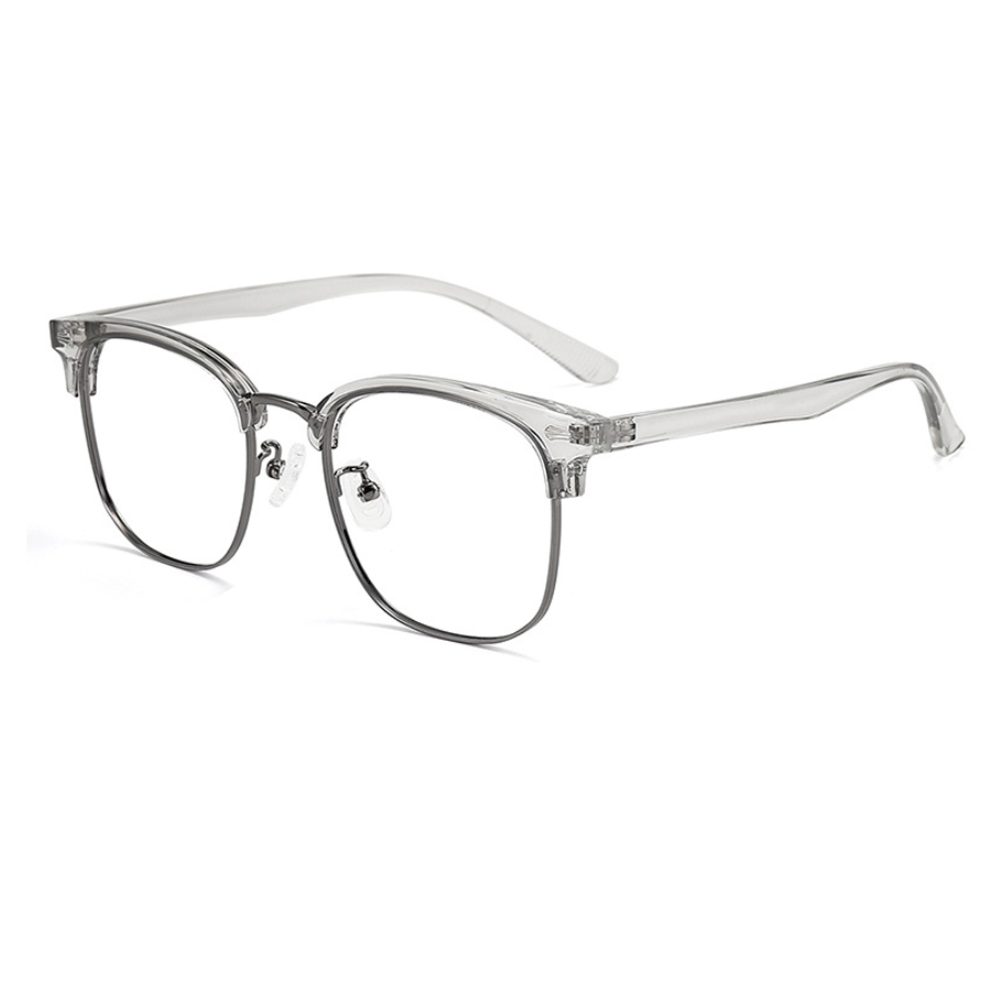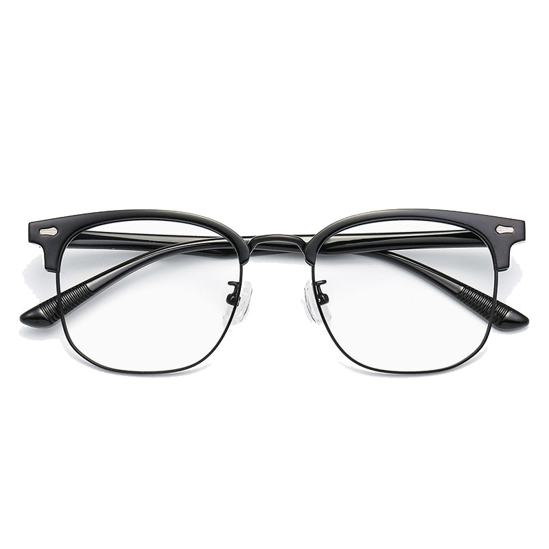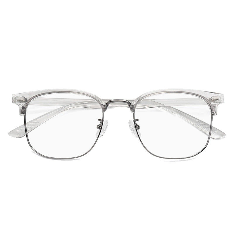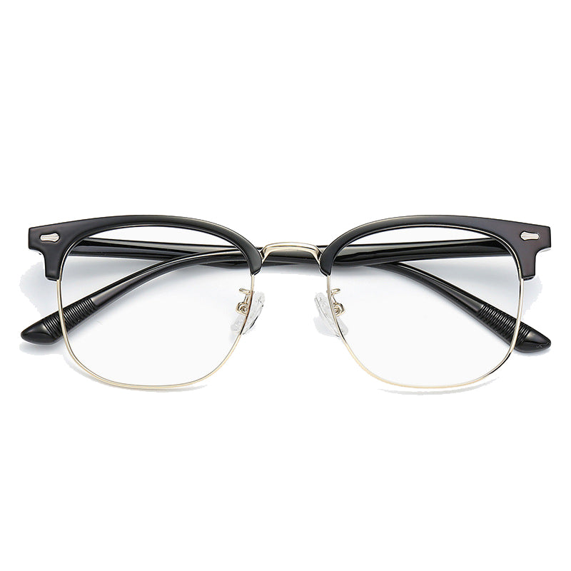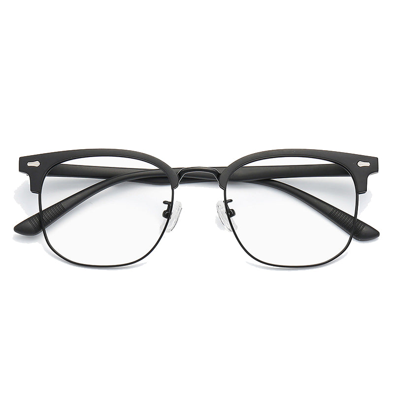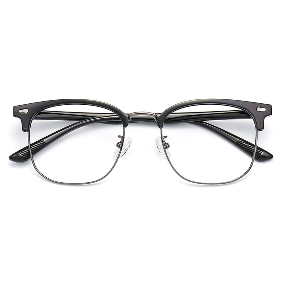 The frame of these eyeglasses combines two primary materials. The top brow bar and temples are crafted from lightweight and durable plastic or acetate, providing a smooth finish and comfortable wear. The lower lens rims are made of metal, likely stainless steel or alloy, which offers strength, flexibility, and a sleek look. The clear nose pads, likely made of silicone or plastic, ensure comfort and minimal visual distraction, and the metal hinges and screws provide secure and adjustable connections.