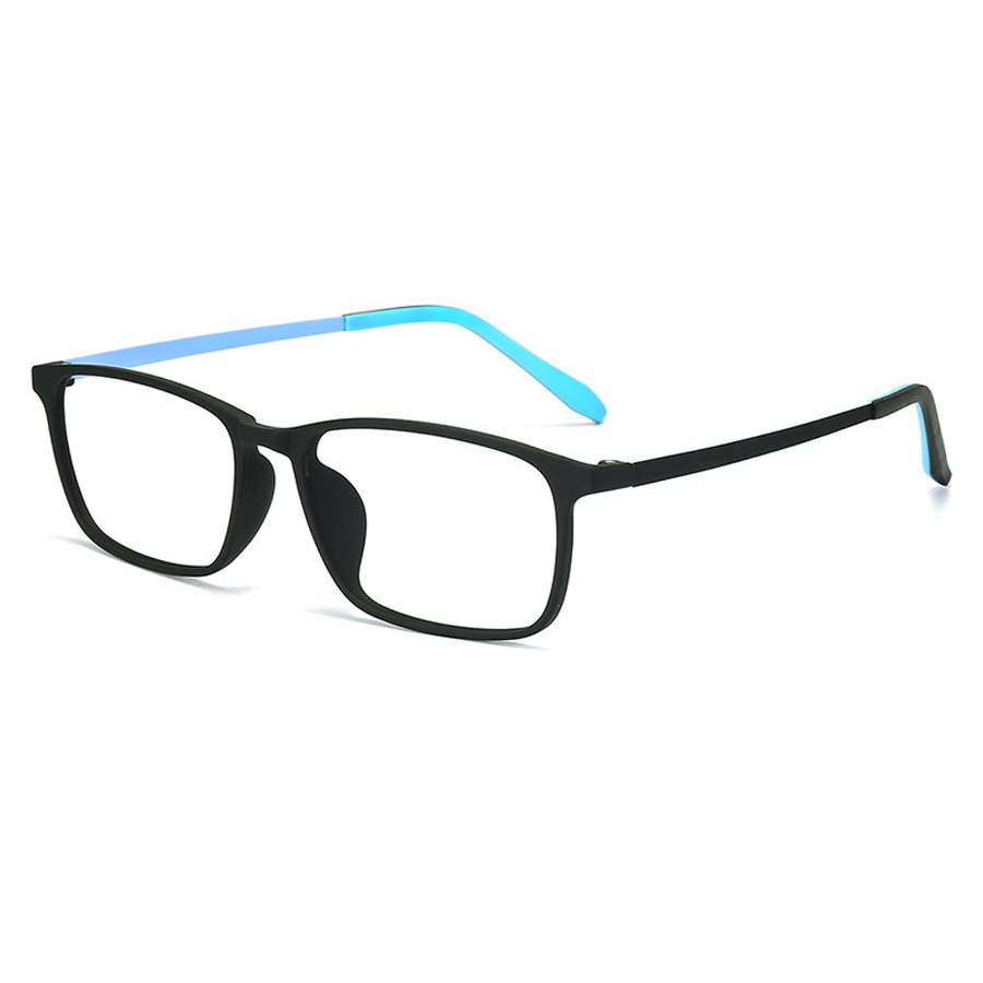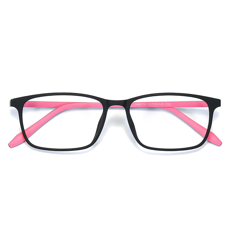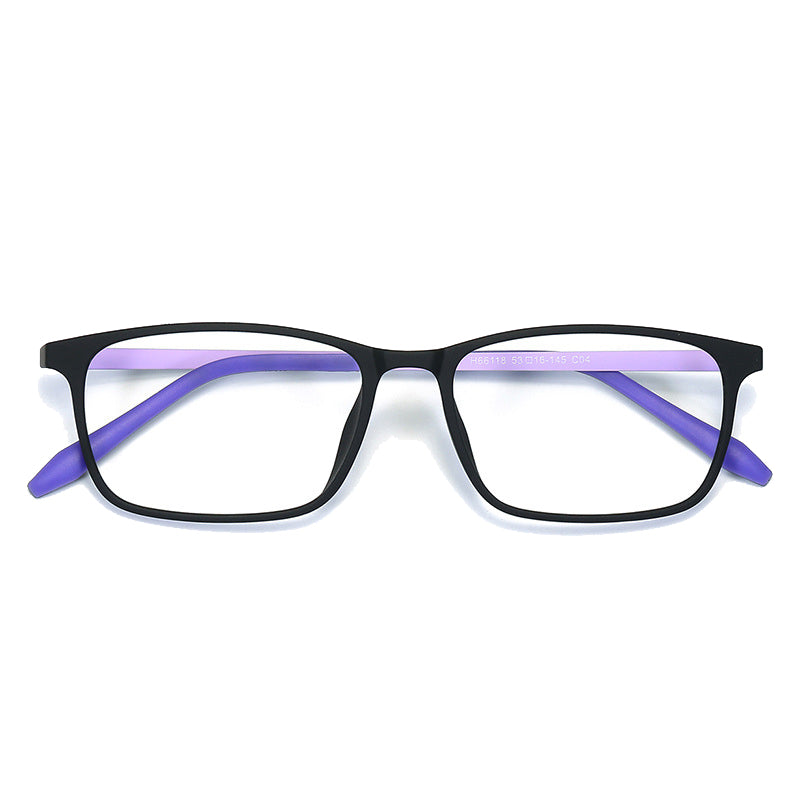 The primary frame, crafted from lightweight and durable plastic (likely TR90 or nylon), is matte black, which not only reduces glare and scratches but also gives a sleek, modern appearance. The temples combine the matte black main section with colored accents in pink (C02), light blue (C03), gray (C05), purple (C06), and black (C01, solid). You can choose from color combinations like Black Black, Black Blue, Black Gray, Black Pink, and Black Purple to suit your personal style.