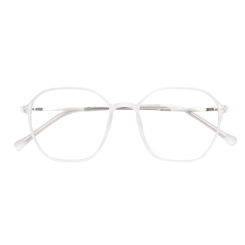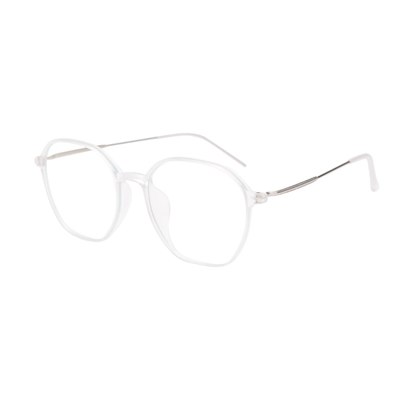 The frame construction is a smart combination of lightweight plastic (likely acetate or TR90) for the main lens rims and bridge, and thin, polished metal (stainless steel or titanium) for the top bar, hinges, and arm cores. The lenses are transparent, scratch-resistant, and potentially anti-blue light treated, offering protection during long hours of screen time. The rounded, soft-touch plastic arm tips ensure comfort and a good grip.