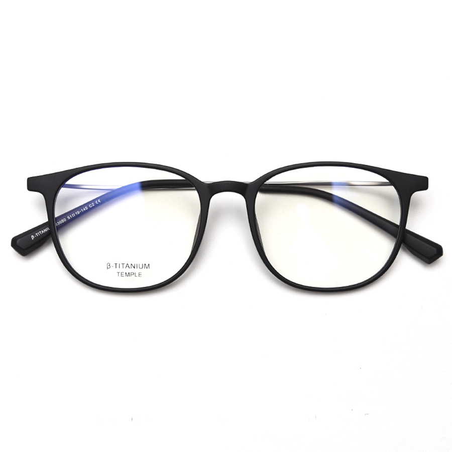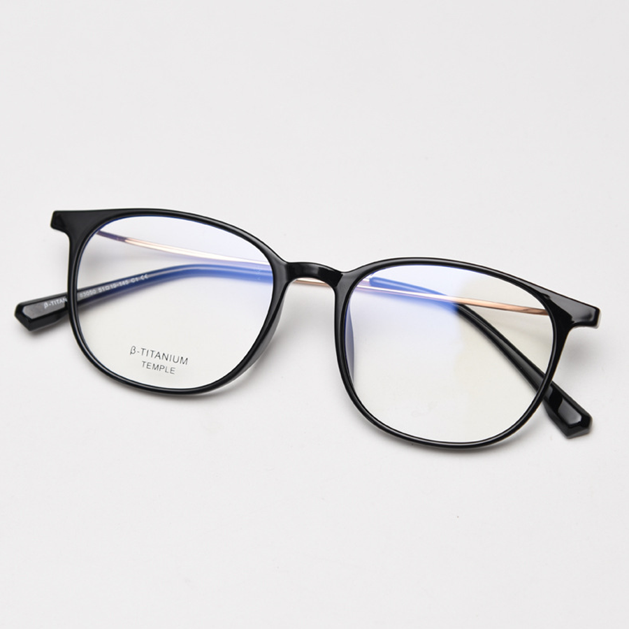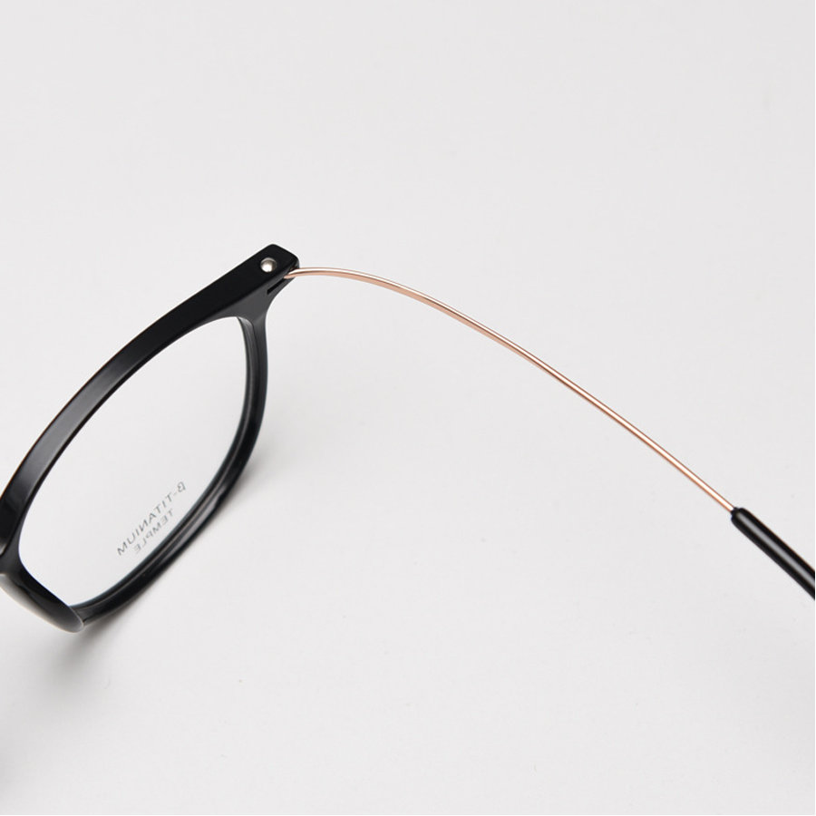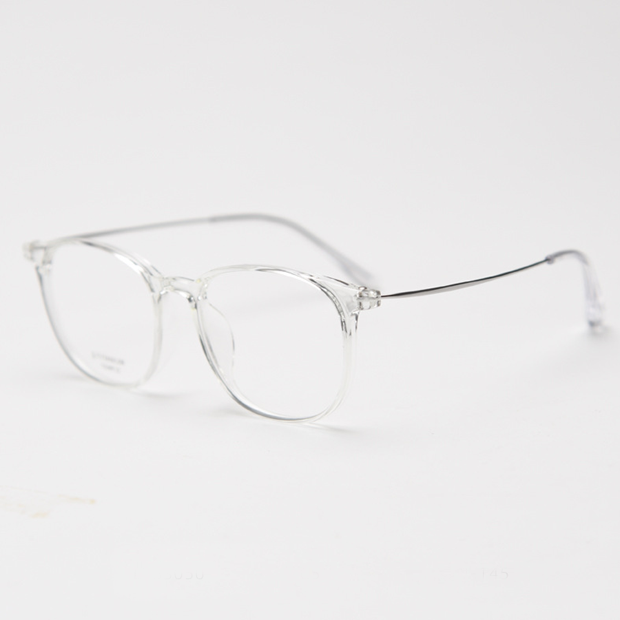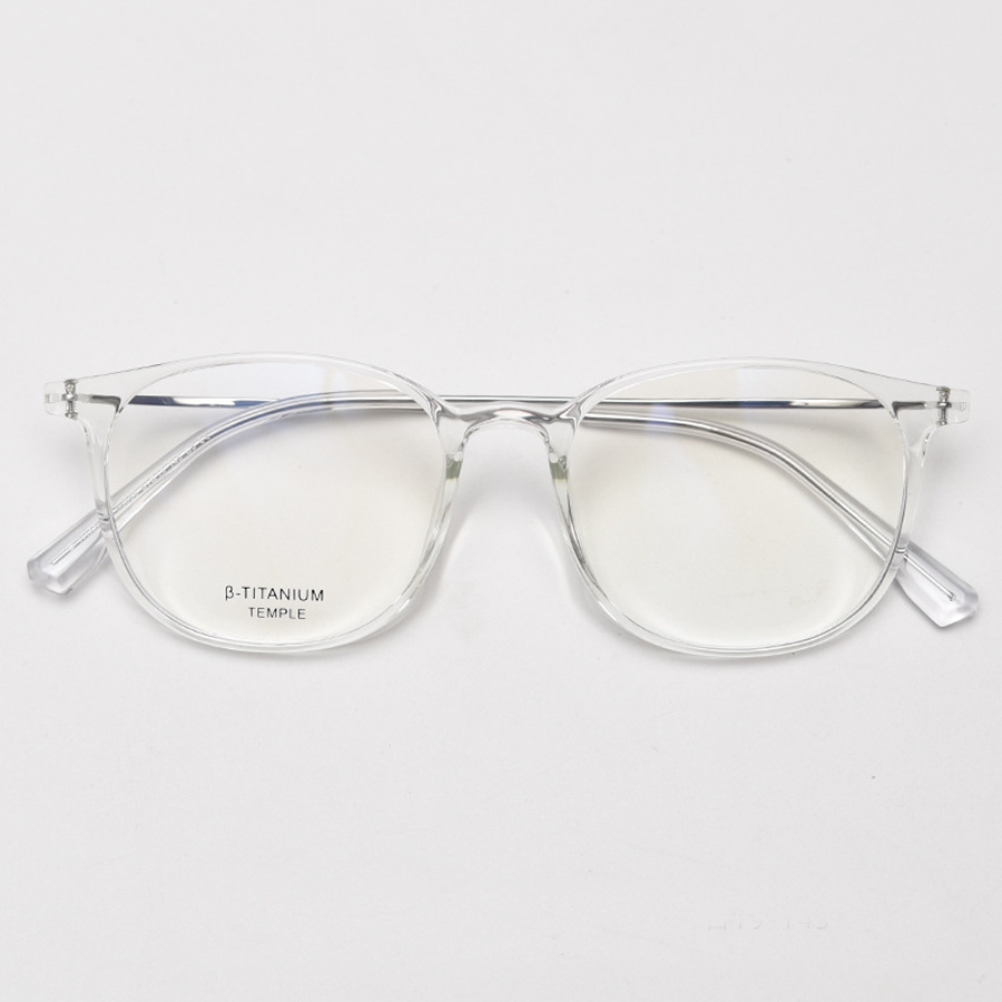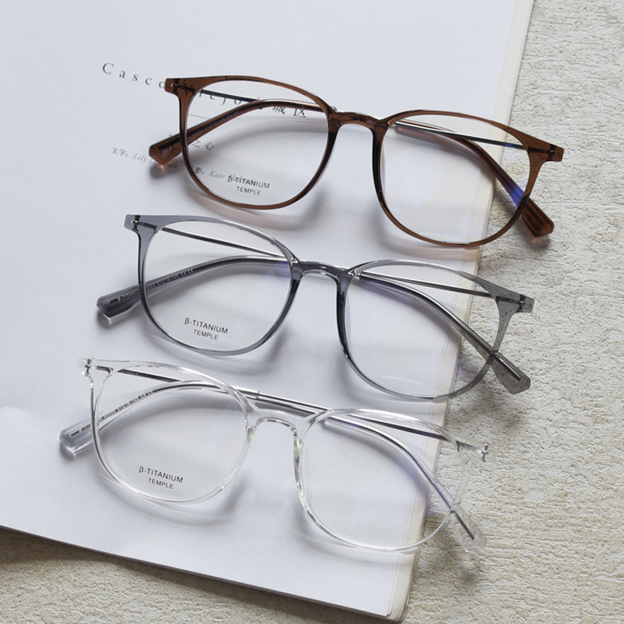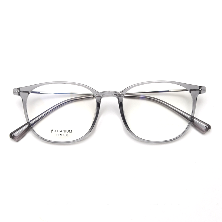 The frame is a masterful combination of materials. The temples are crafted from β – Titanium, a material renowned for its lightness, flexibility, and durability. It’s also hypoallergenic, ensuring long – term wear is comfortable. The main frame is made of plastic or acetate, available in finishes like matte black, glossy black, or transparent (clear/gray). The lenses are likely made from materials such as CR – 39 or polycarbonate for clarity and scratch resistance, and they come with an anti – blue light coating, indicated by a faint blue tint.