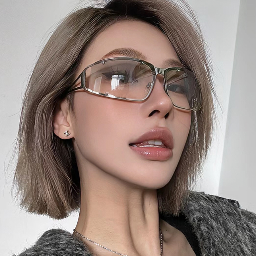 | Design Elements | Angular rectangular lens shape, cut – out triangular sections on temples, decorative metallic rivets/screws on lens edges, thin minimalist bridge |