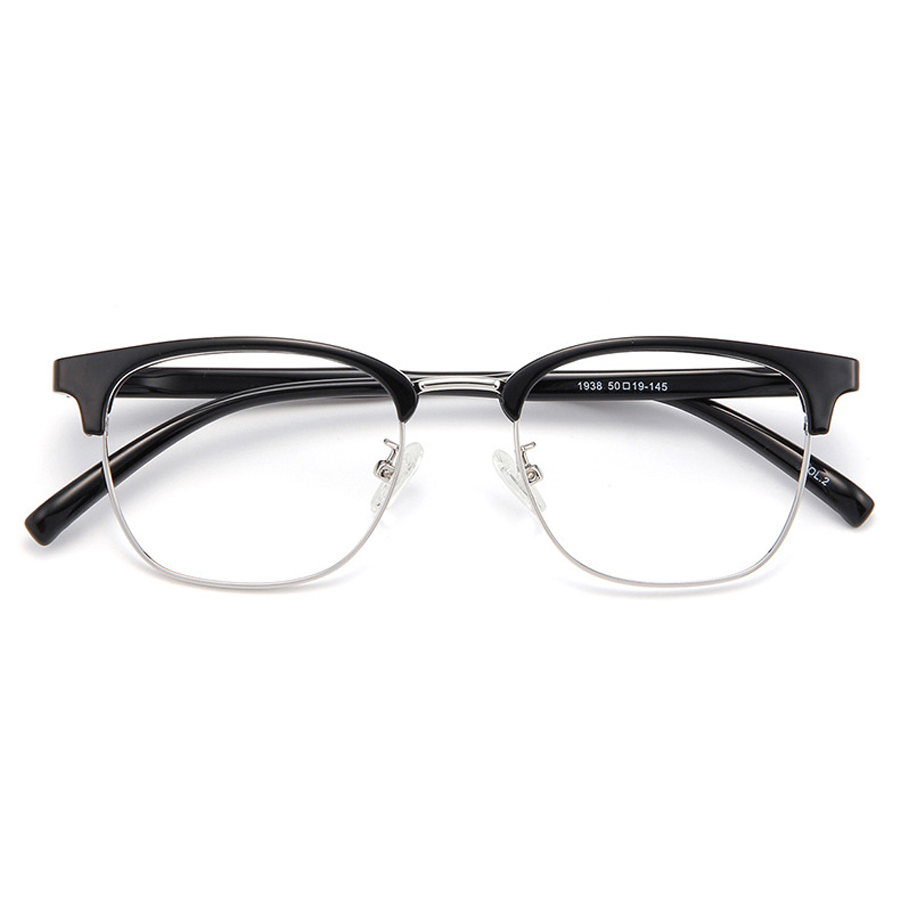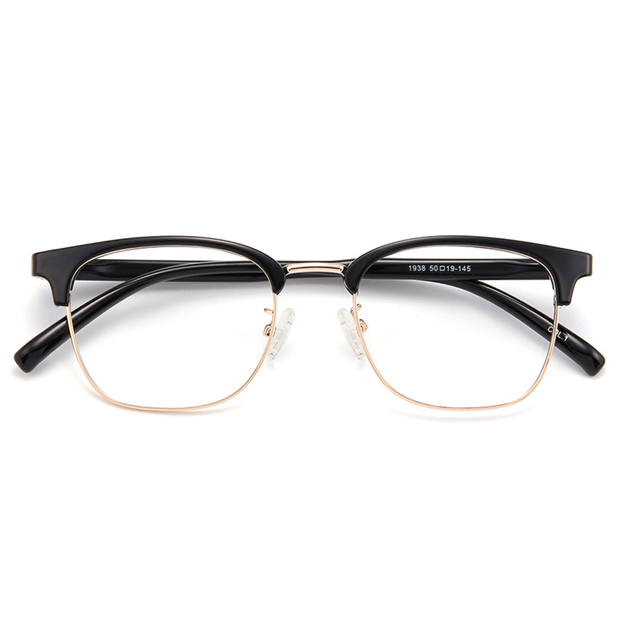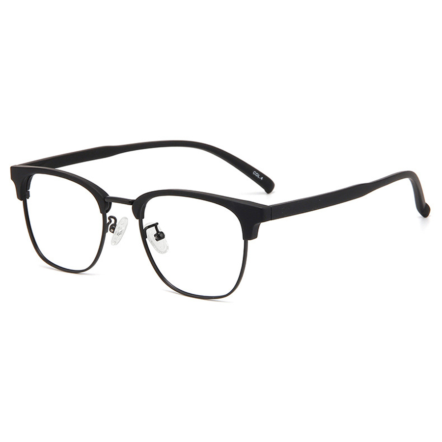 The frame features a durable and lightweight plastic/acetate brow bar and temples in a sleek black finish, available in both matte and glossy options. The lower lens rims and hinges are crafted from metal, likely an alloy, stainless steel, or aluminum, providing strength and a polished look. The metal rim comes in various finishes including silver (chrome), gold (light rose gold), and gunmetal (dark gray), offering versatile color options to match different style preferences.