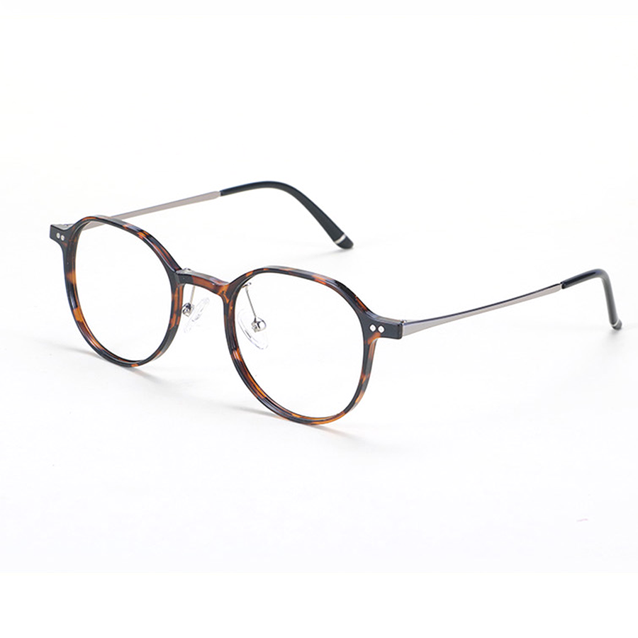 These round optical eyeglasses are crafted from a sophisticated blend of materials. The lens rims are made of tortoiseshell – patterned acetate or plastic, providing durability and a unique marbled aesthetic reminiscent of vintage styles. The temples are a combination of metal, likely stainless steel or alloy, with plastic/metal accents, featuring sleek, thin arms and metallic tips or matte finishes. The hinges and bridge are metallic, either silver or gold – toned, offering strength and adjustability. The clear nose pads, probably made of silicone or plastic, ensure comfort and prevent slipping.