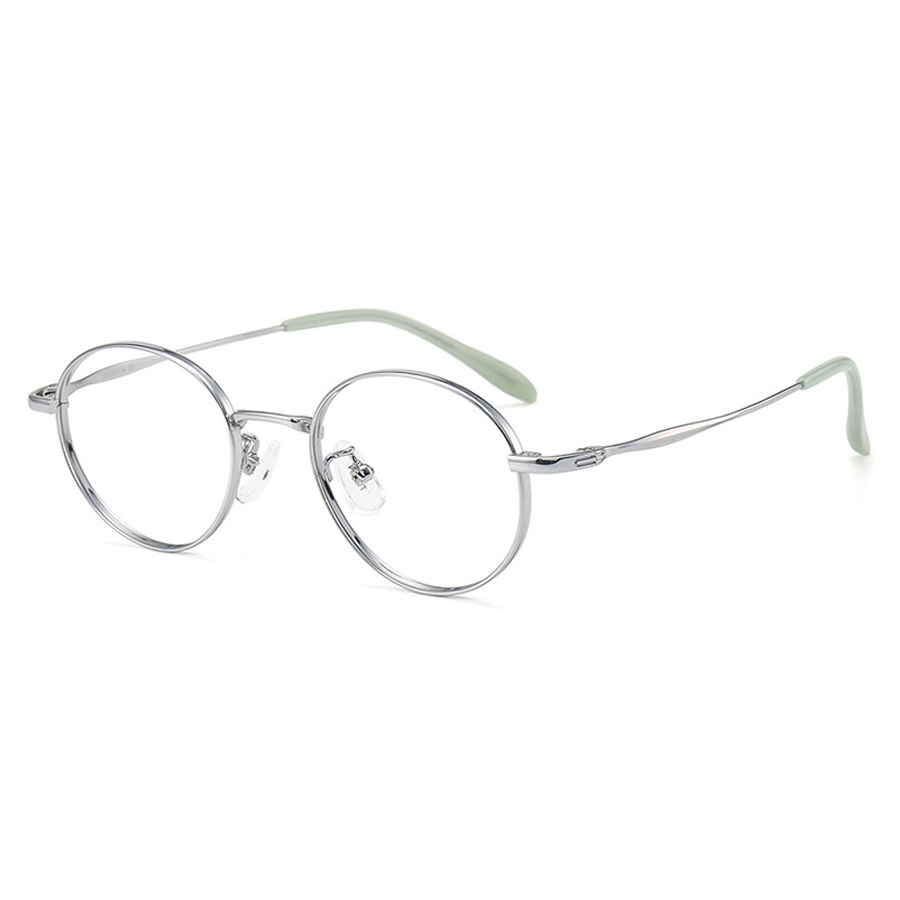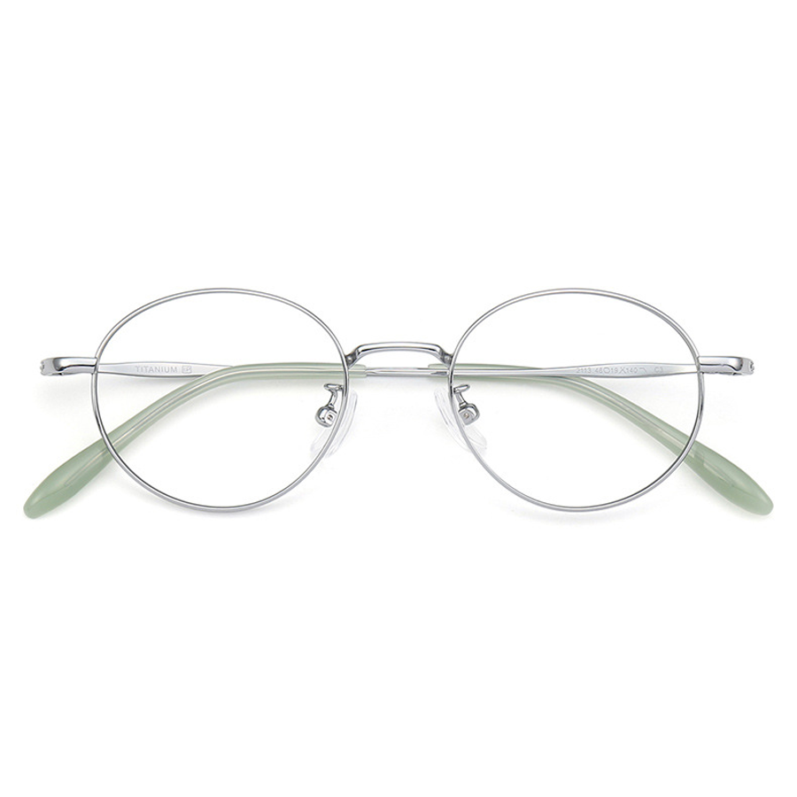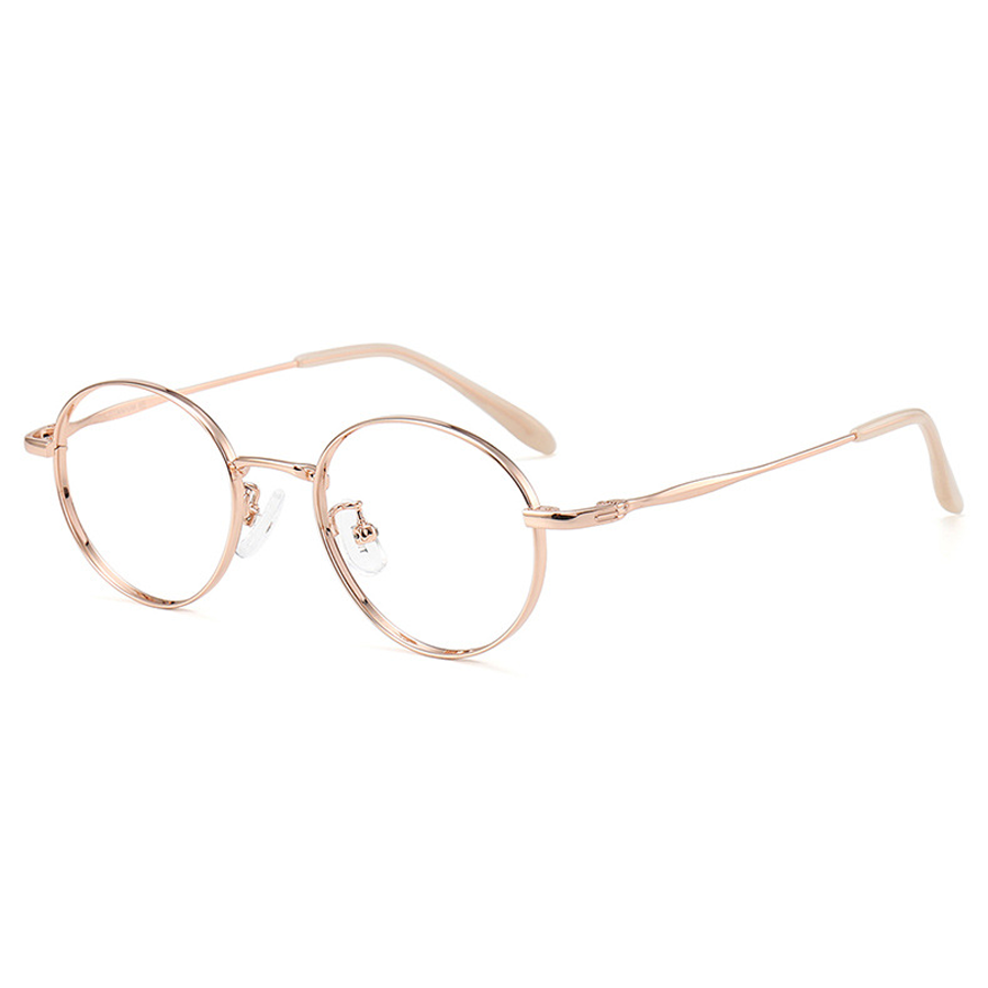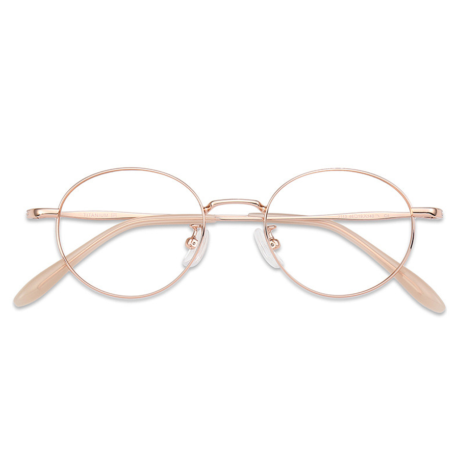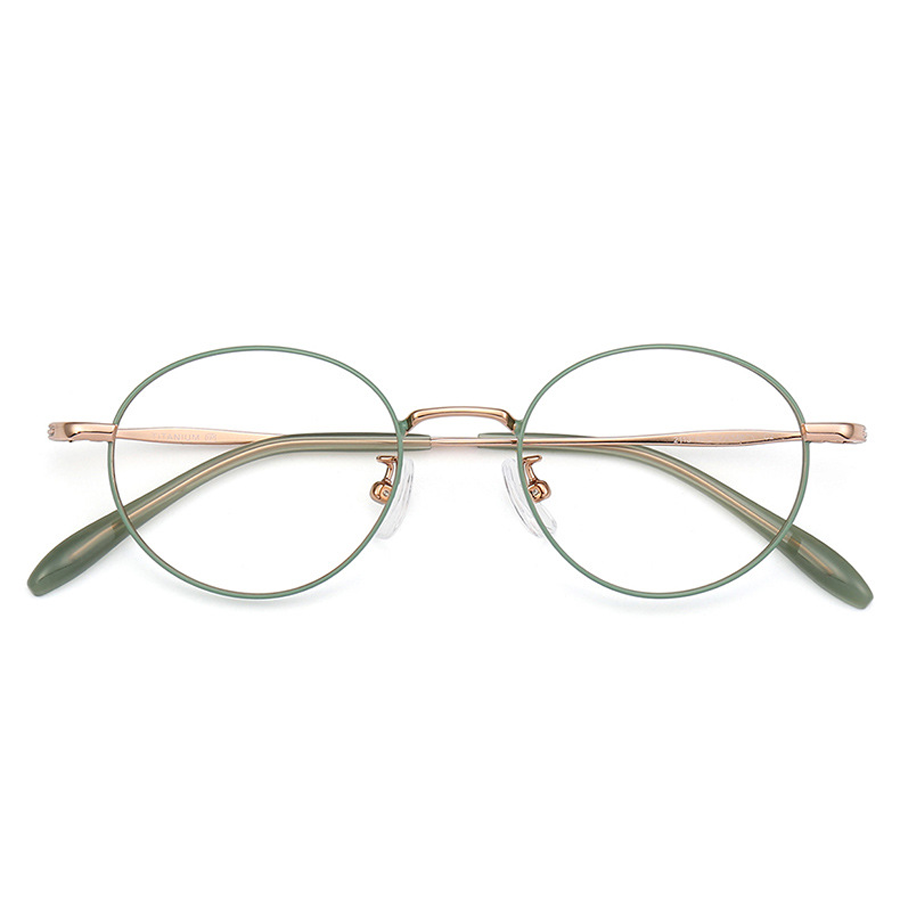 Available in a variety of colors including black, green rose gold, rose gold, and silver, you can choose the one that best suits your personal style. The classic round lenses with thin, delicate metal rims give a minimalist and retro – inspired look. The smooth, curved metal temples with colored end tips add both style and comfort. The frames feature visible “TITANIUM” engravings on the temples, along with small decorative hinges and nose pads, and a clean, polished metal finish.