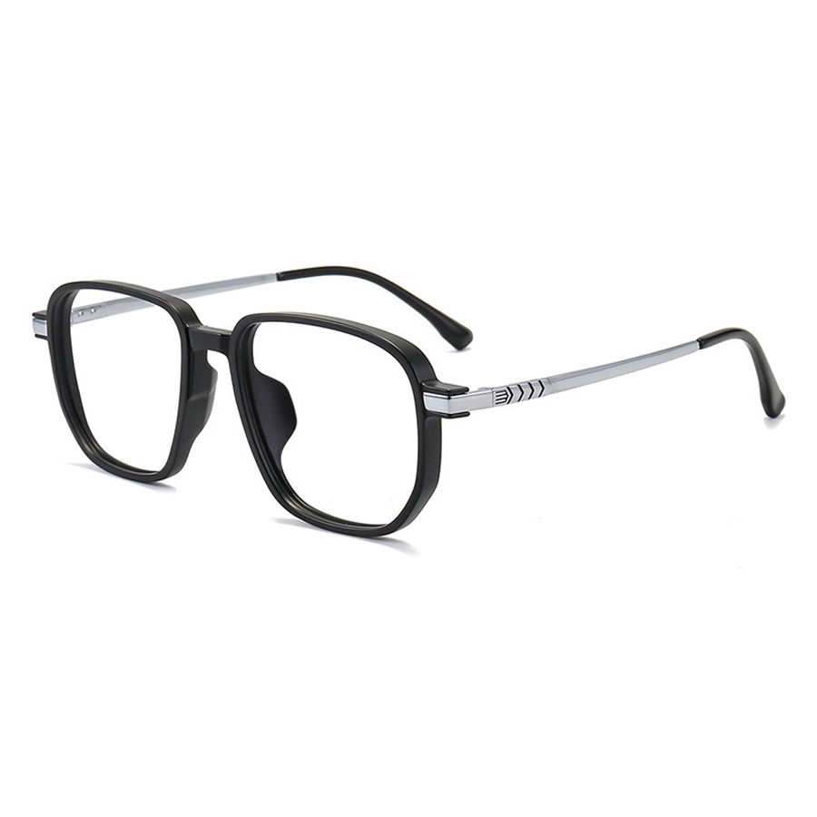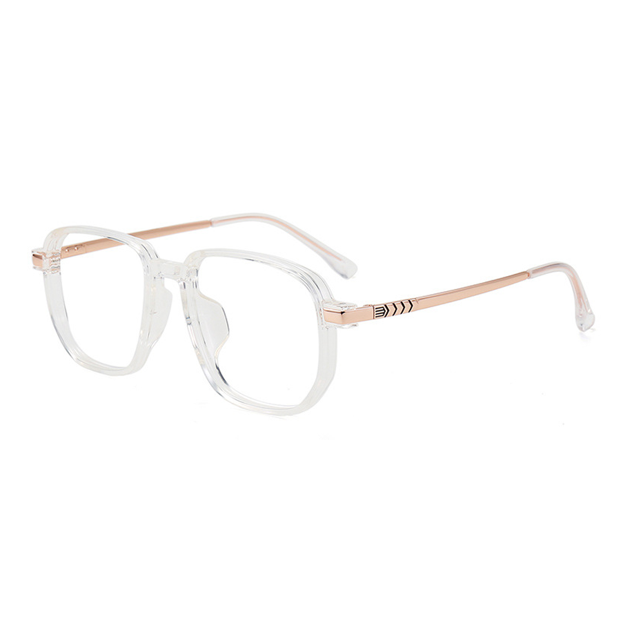 Available in a range of stylish colors including Black Gold, Black Silver, Gray, and White, these eyeglasses also come with a variety of color combinations. The primary colors of the frames are black, clear/transparent, and gray, complemented by metal accents in gold, rose gold, or silver. The bold square/rectangular frames have smooth, minimalist lines, and the metal temples feature decorative arrow – like patterns. The polished metal joints connecting to the front frame add a sleek, modern touch. The front frames have a glossy or matte finish, while the metal temples are shiny and reflective.