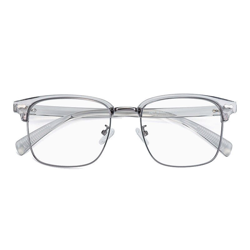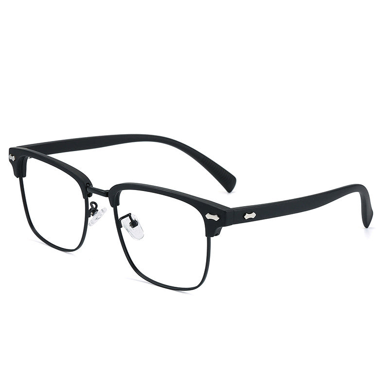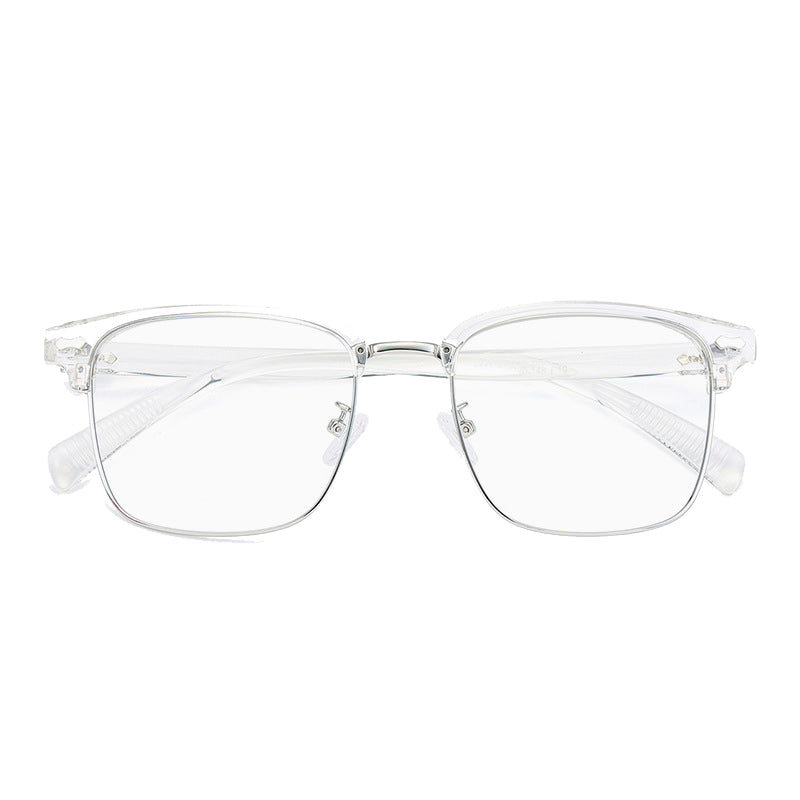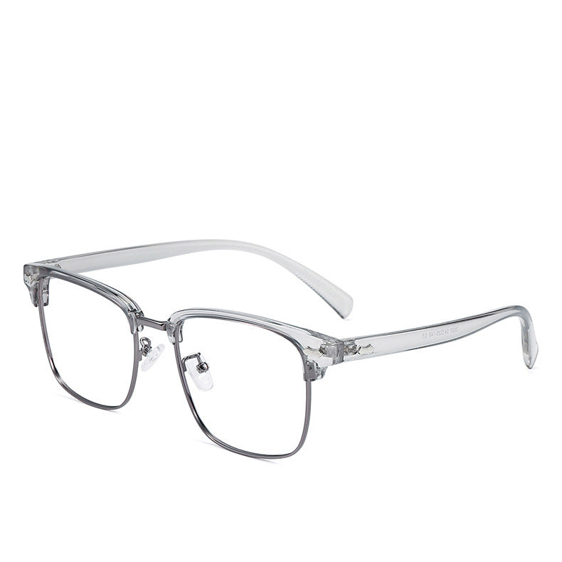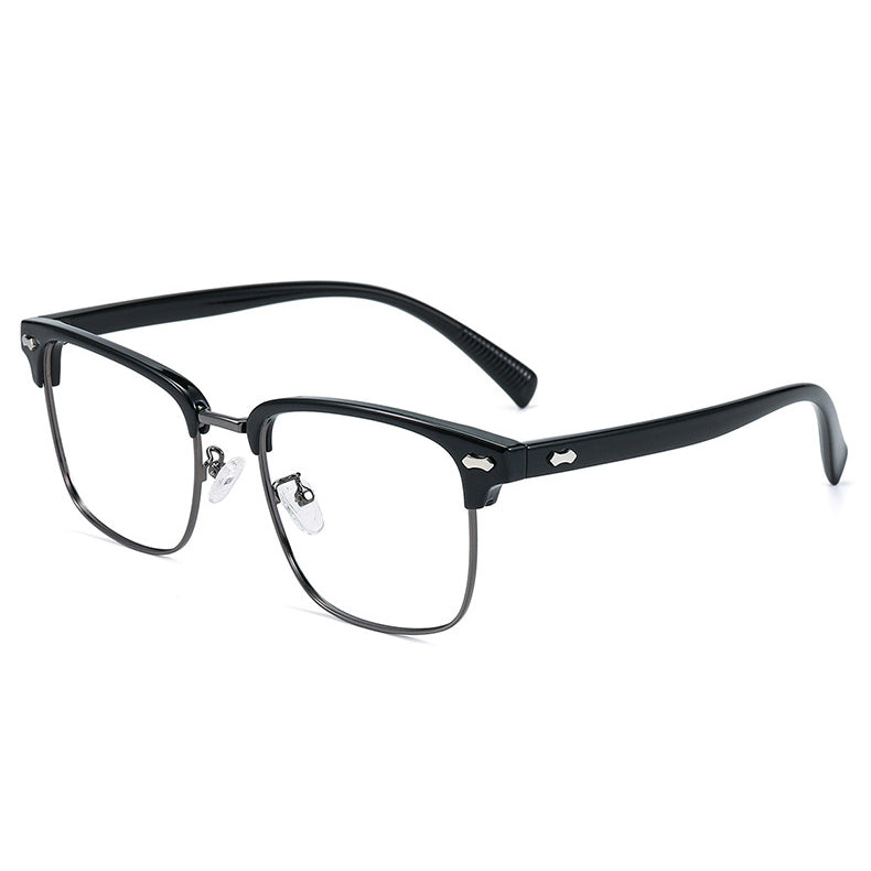 The frames are a masterpiece of material combination. The top brow bar and temple arms are crafted from durable plastic (acetate/resin), available in colors like black, clear, or gray, providing a sleek finish and sturdy structure. The lower lens rim and hinges are made of a lightweight metal alloy, likely stainless steel or titanium, which comes in gold, silver, or black, offering flexibility and clarity. The soft, transparent plastic/silicone nose pads ensure maximum comfort and a secure grip, while the textured plastic/rubber temple grips prevent slipping.