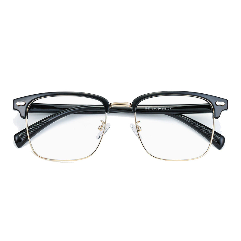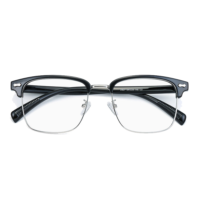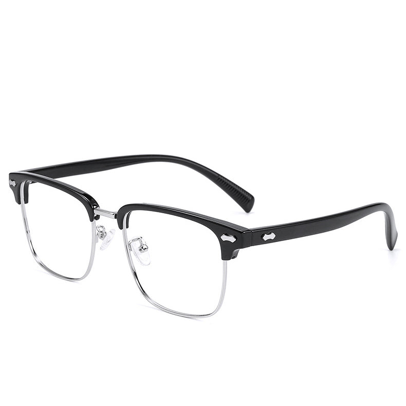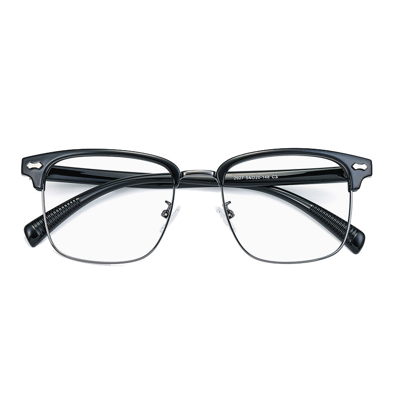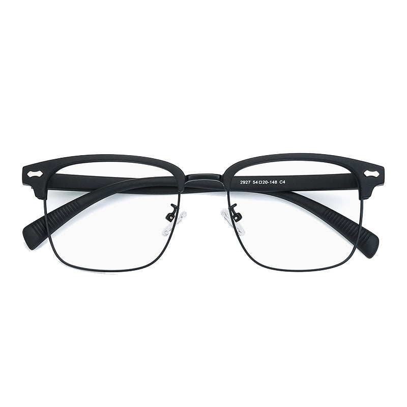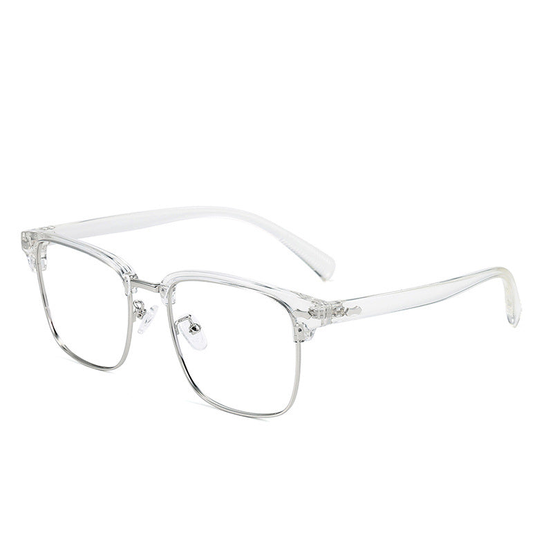 The frames are a masterpiece of material combination. The top brow bar and temple arms are crafted from durable plastic (acetate/resin), available in colors like black, clear, or gray, providing a sleek finish and sturdy structure. The lower lens rim and hinges are made of a lightweight metal alloy, likely stainless steel or titanium, which comes in gold, silver, or black, offering flexibility and clarity. The soft, transparent plastic/silicone nose pads ensure maximum comfort and a secure grip, while the textured plastic/rubber temple grips prevent slipping.