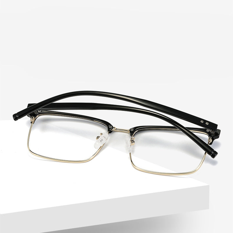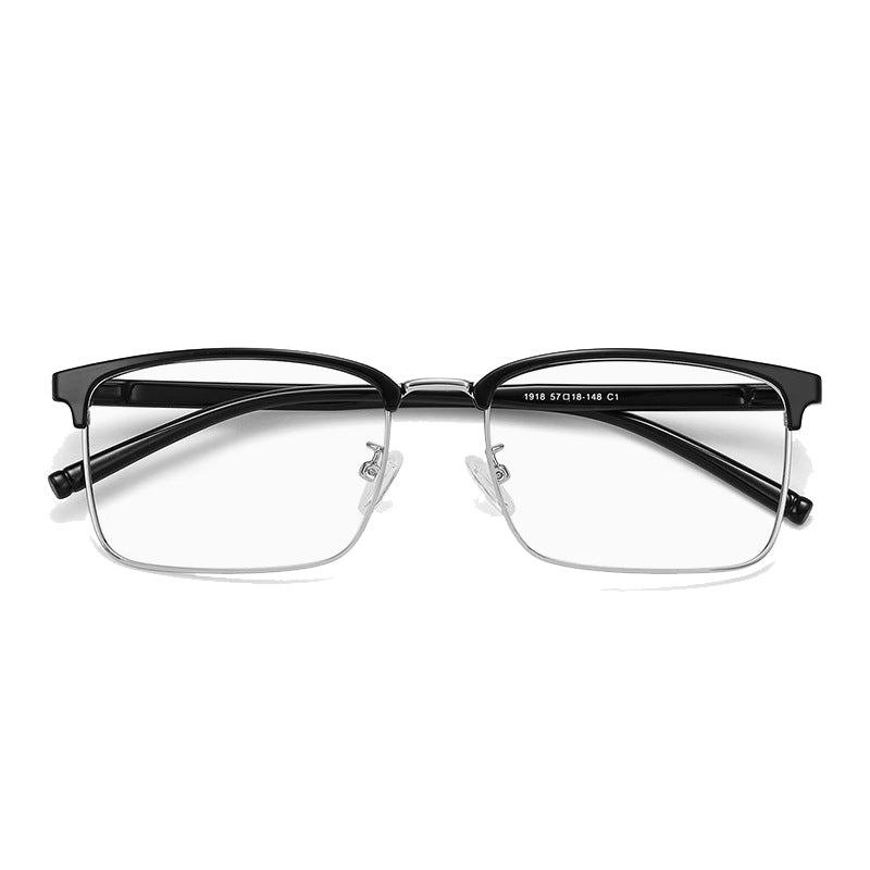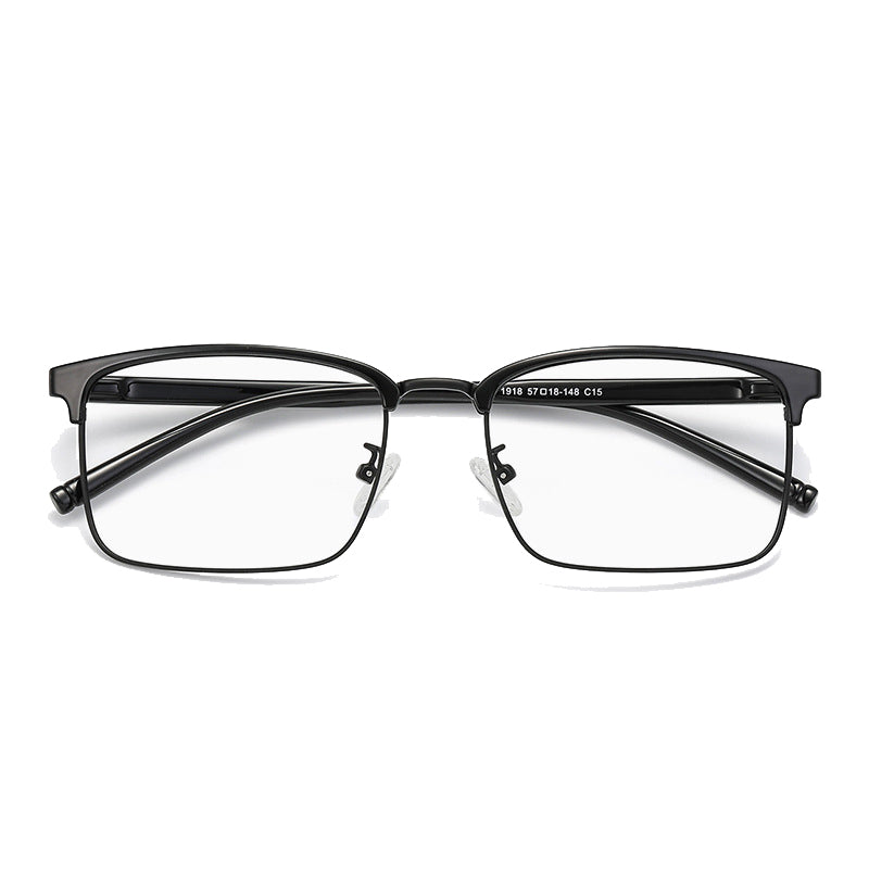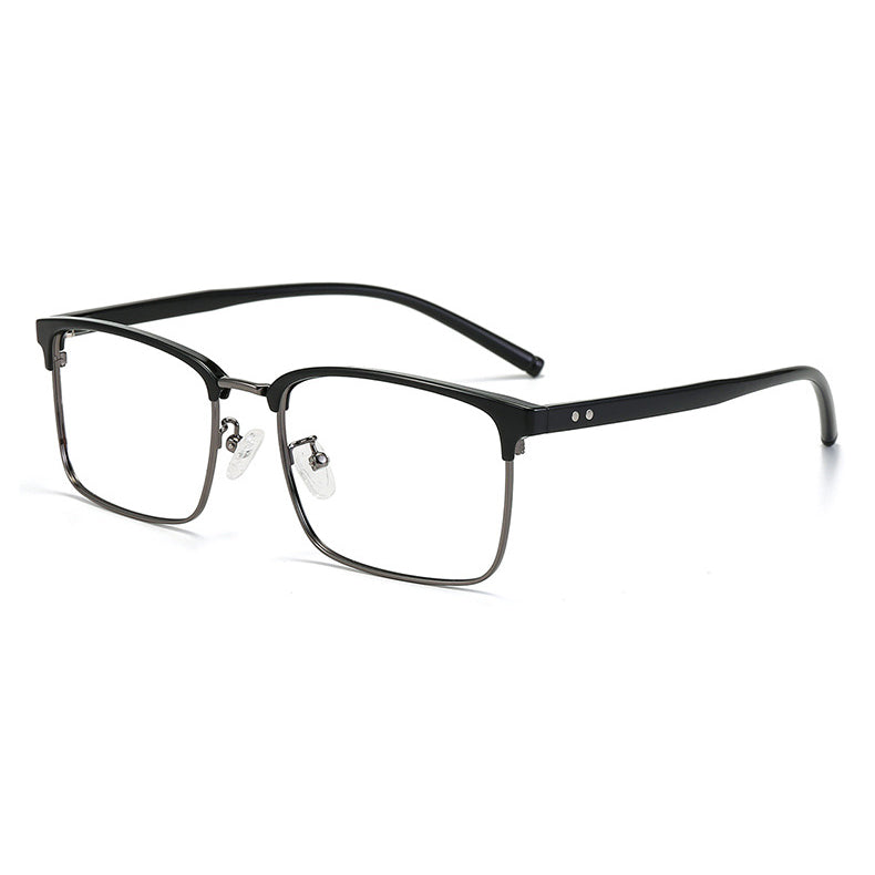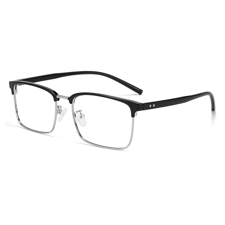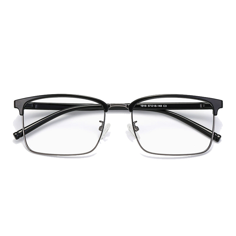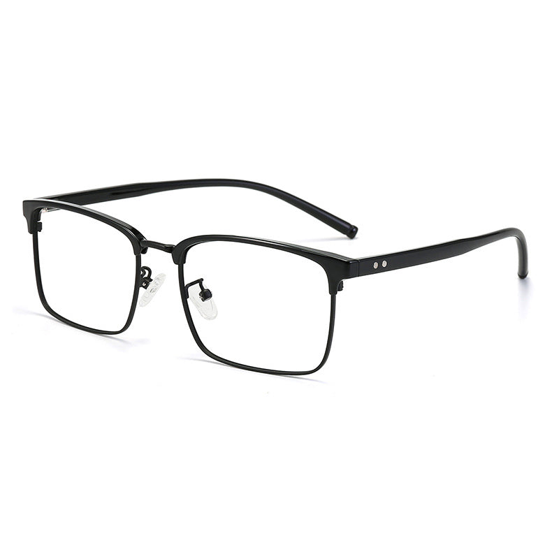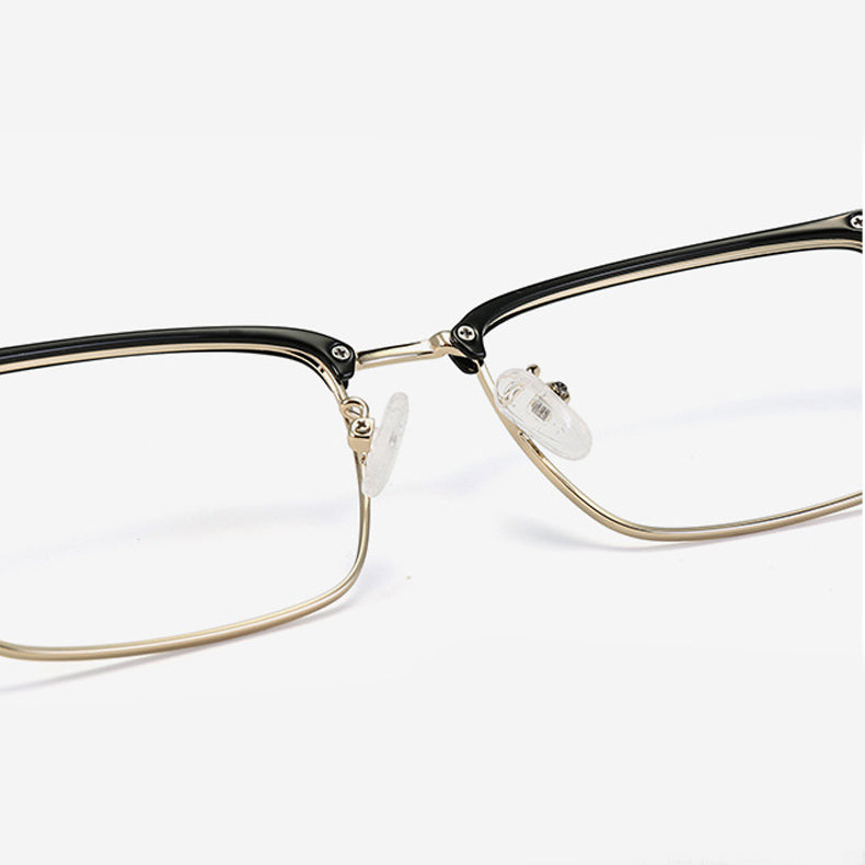 With a dominant black color in the plastic frame and metallic accents, these glasses exude a classic, minimalist aesthetic. The rectangular/square lens shape with a “top bar” (half – rimmed) design is both stylish and practical. The temple arms feature a matte black finish with subtle metal rivets/screws, adding a refined touch, and the translucent nose pads ensure minimal visual interference.