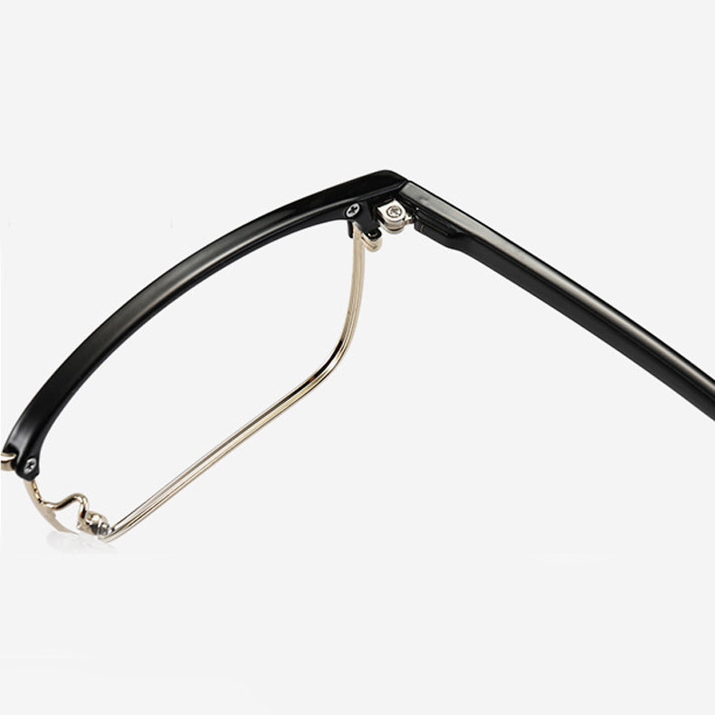 | Frame Structure | Black plastic/acetate (top bar and temple arms), metallic (gold/silver/black) metal (lower lens rim and hinges) |