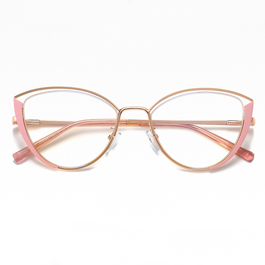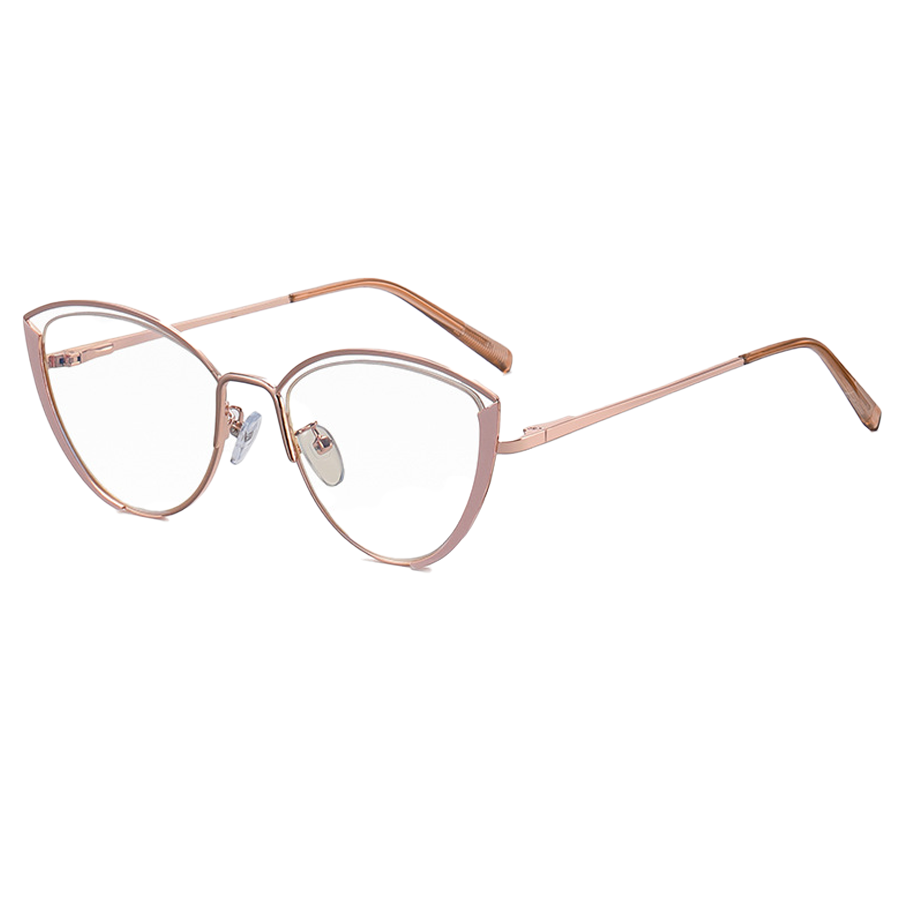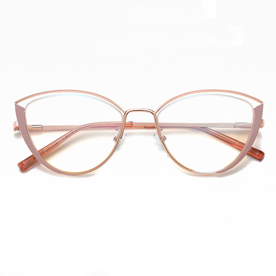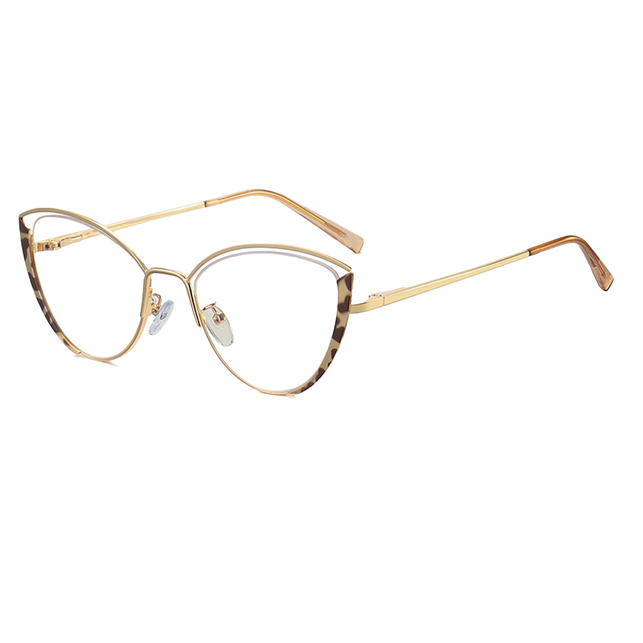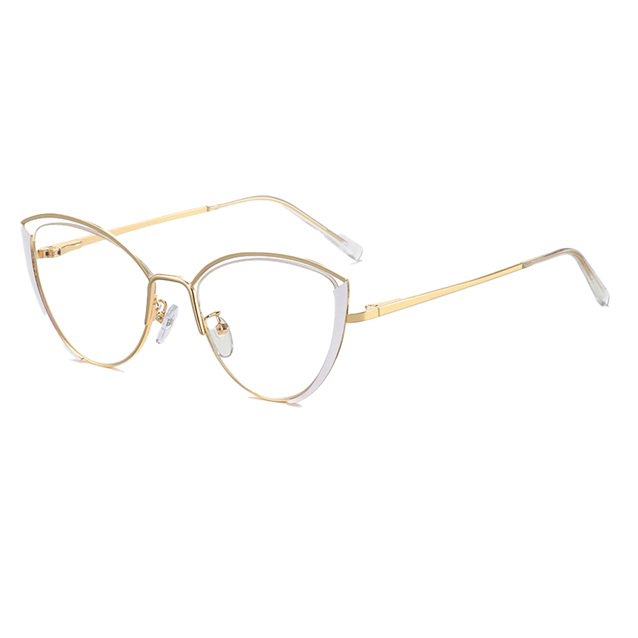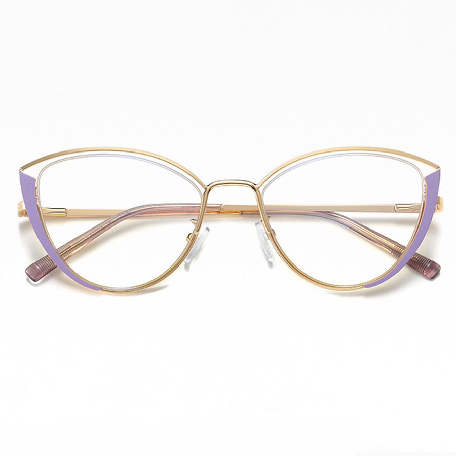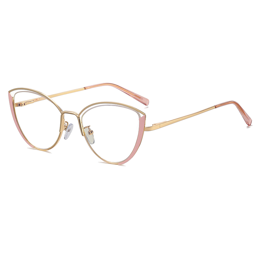 The frame structure is primarily crafted from a lightweight metal alloy, likely titanium or zinc alloy, which ensures durability without sacrificing comfort. The polished metal edges with a gold/rose gold plating add a touch of elegance. The temples have a metal core coated with colored plastic or acetate, available in transparent, pink, purple, black, and other shades, offering both a good grip and a stylish appearance. Some temples even feature a gradient or textured finish, with rubberized tips for extra comfort.