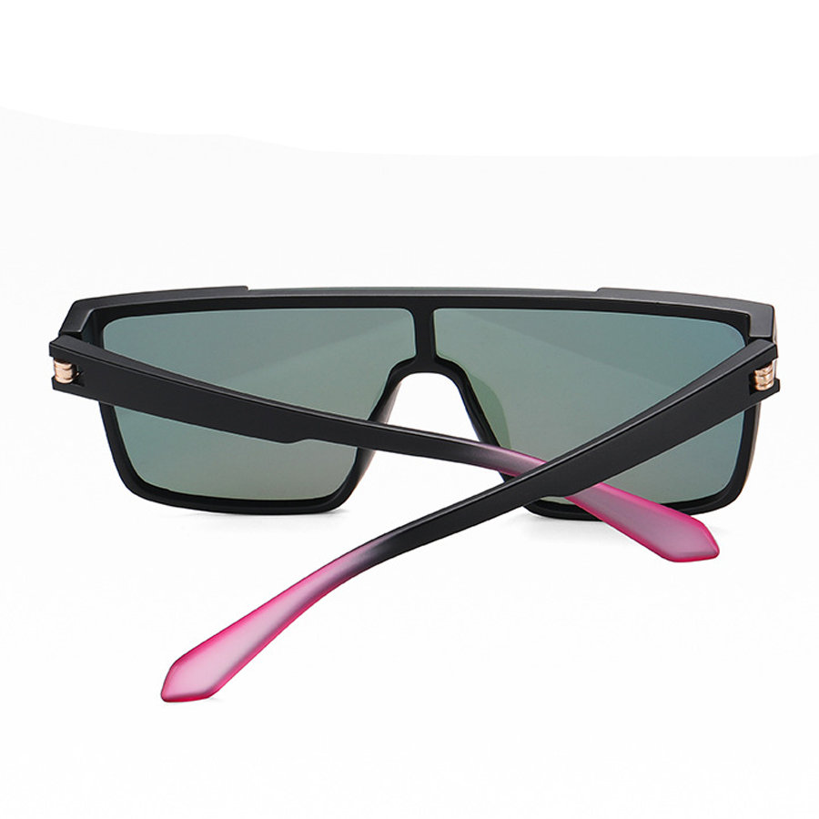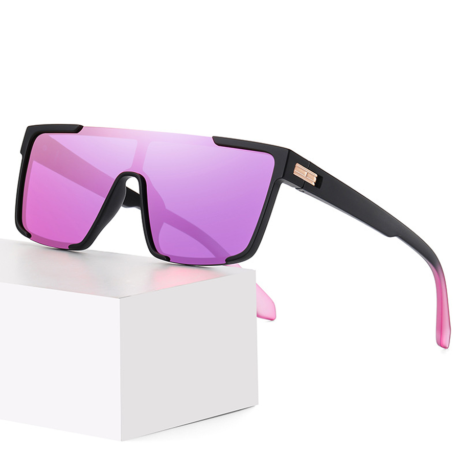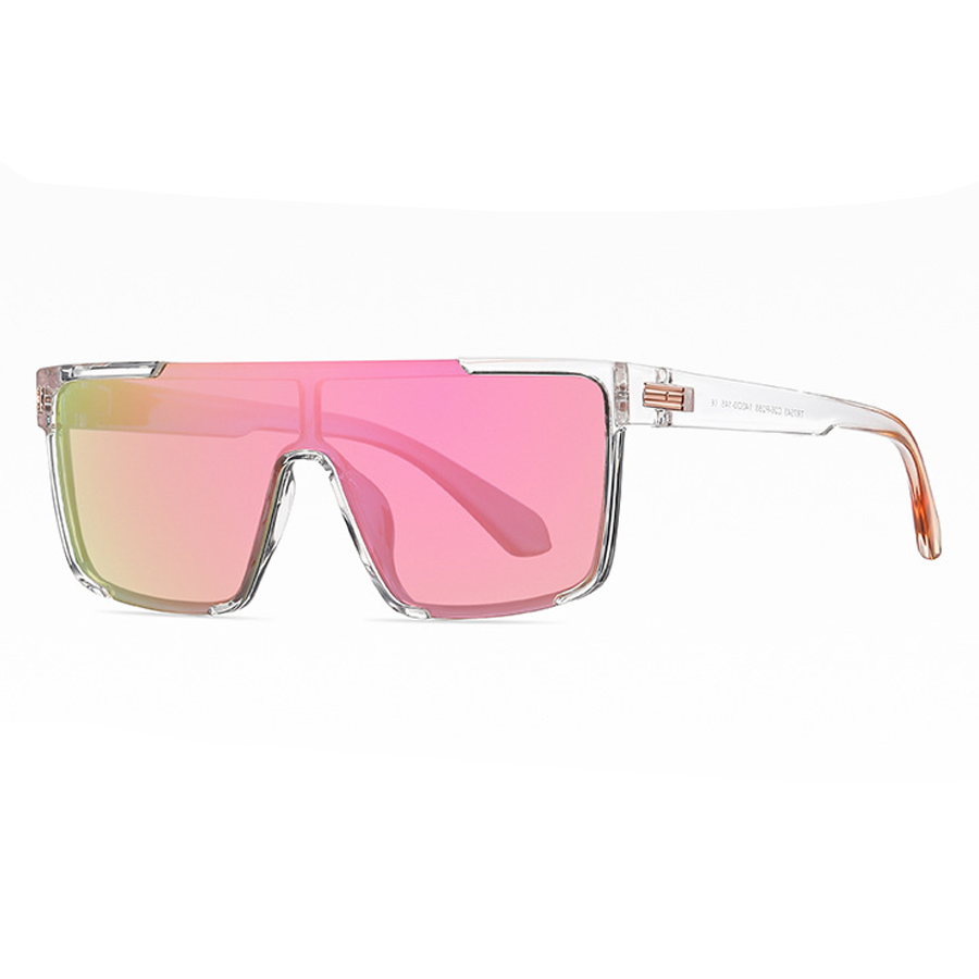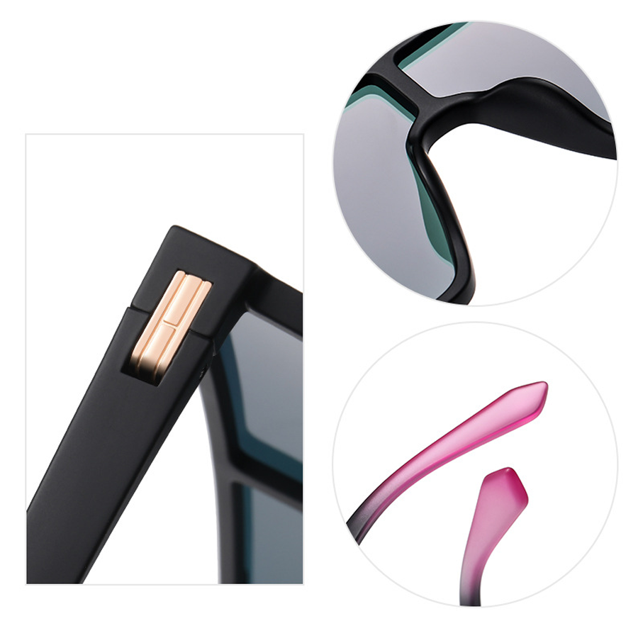 The frame is crafted from lightweight, durable plastic such as TR90 or acetate, available in finishes like matte or glossy. You can choose from a variety of frame colors including clear (transparent), matte black, and black with transparent side accents, some adorned with elegant metallic accents like rose gold hinges. The lenses are made of a scratch-resistant material, likely polycarbonate, and come in an array of captivating colors. There are tinted gradients like pink to yellow, purple to pink, blue, as well as solid black and mirrored shades such as pink, purple, blue, and green. Dual-tone lens gradients, like pink – purple or blue – yellow, add a unique visual appeal while reducing harsh sunlight.