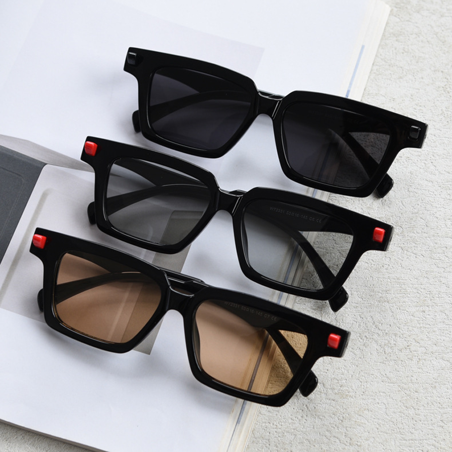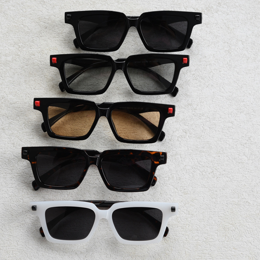 | Frame Design | Angular, square – shaped frames with thick, bold borders; red accents on black frames’ temples; metallic silver strips on temples |
