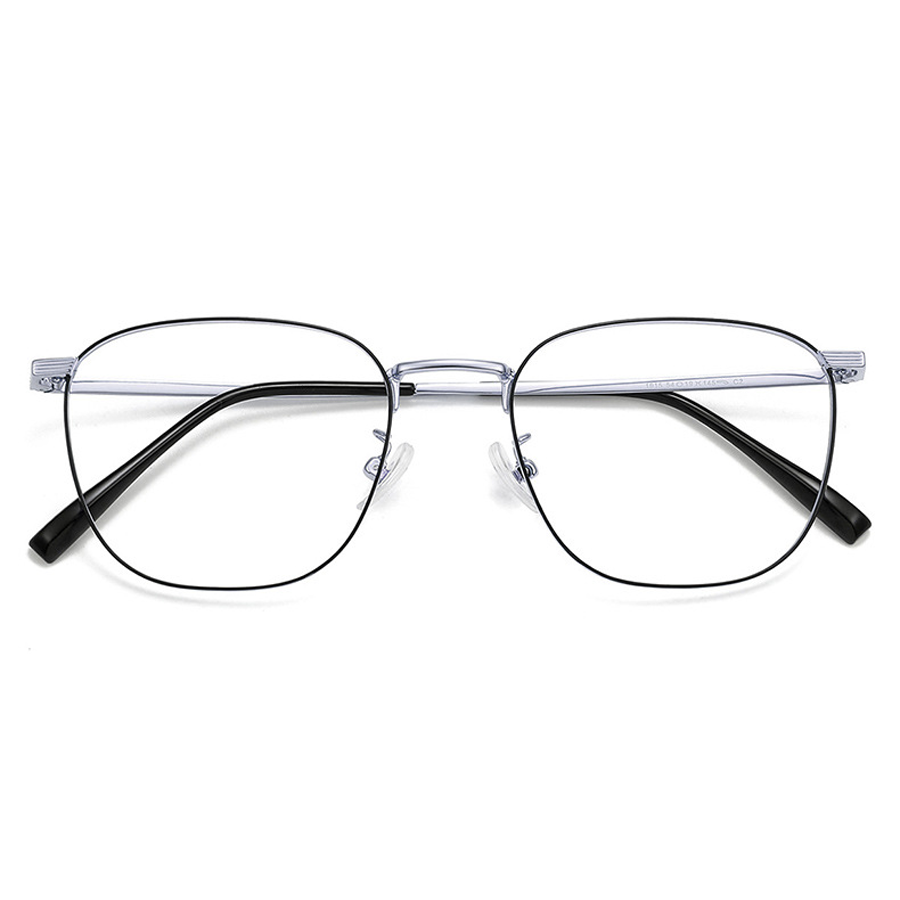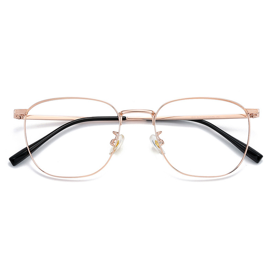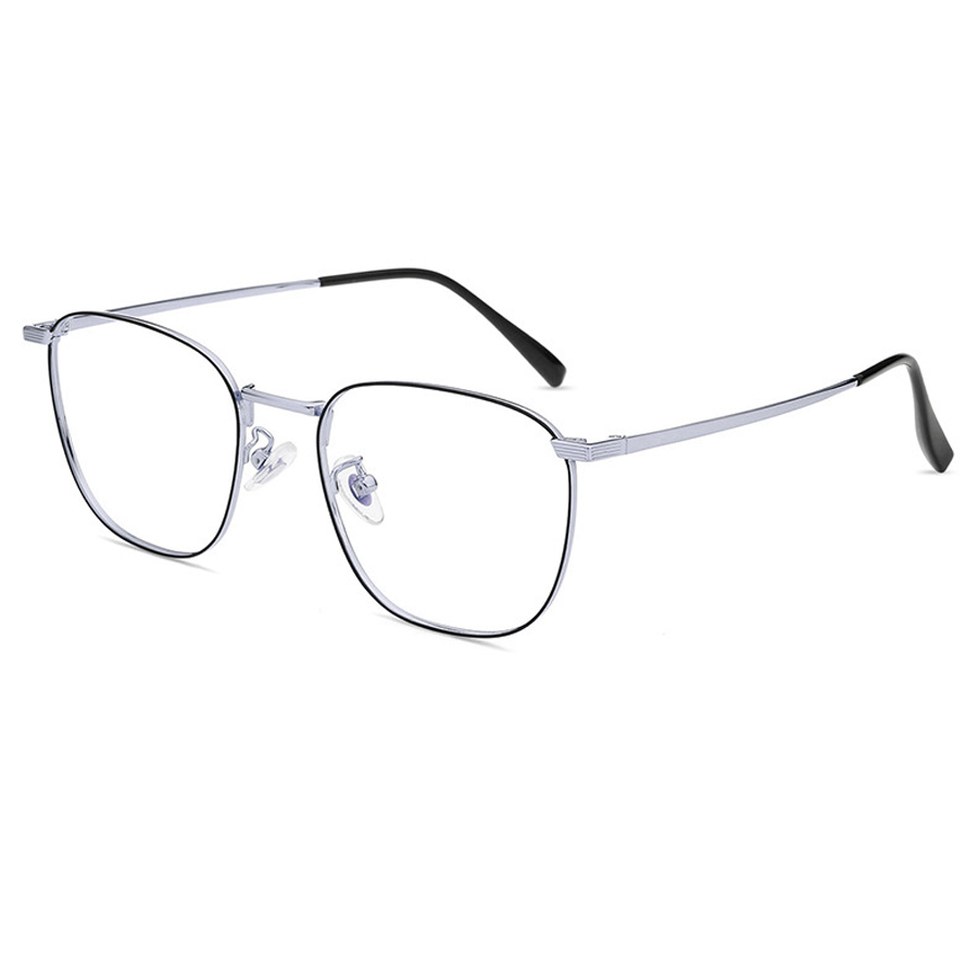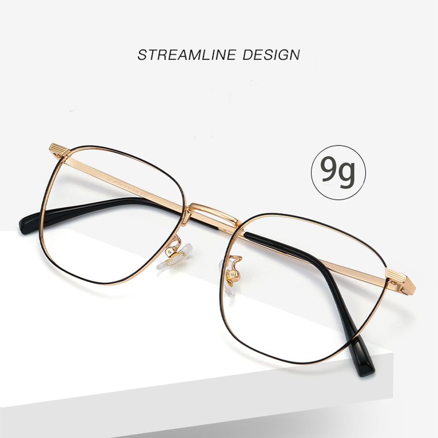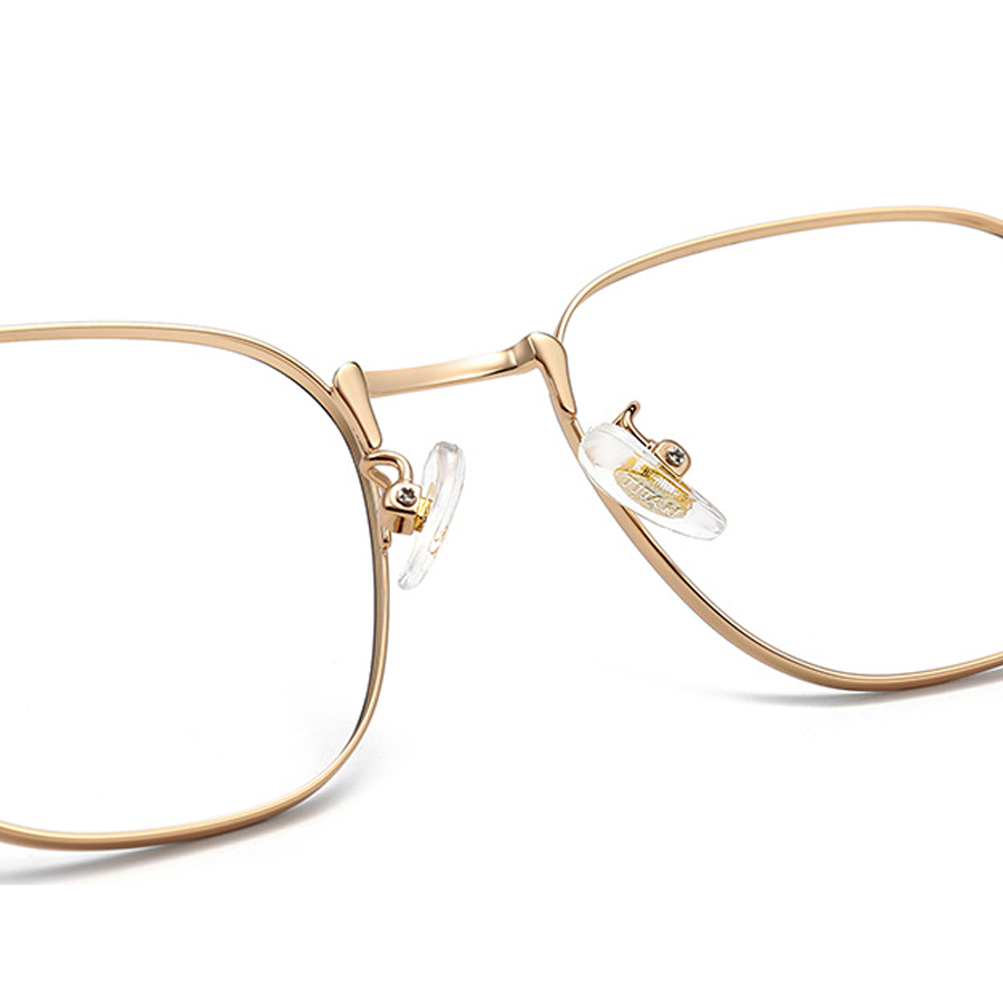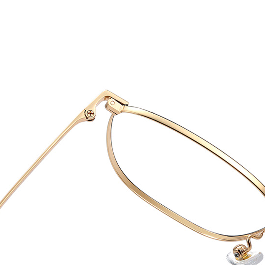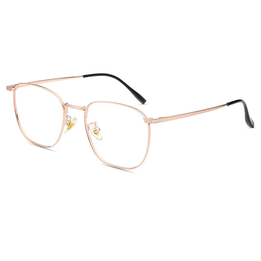The frame of these eyeglasses is crafted from a high – quality metal alloy, likely titanium or stainless steel, which is lightweight and durable. The frame has a polished finish, available in multiple color options including Black, Black Gold, Black Silver, Rose Gold, and Silver. Some models feature a black secondary outline on the lens rim, adding a touch of sophistication. The temple arms are made of lightweight metal with a smooth, reflective surface and are paired with black rubber/plastic tips for a comfortable and secure fit behind the ears. The clear plastic nose pads distribute weight evenly, reducing pressure on the nose, and the metal hinges with visible screw mechanisms allow for adjustability.